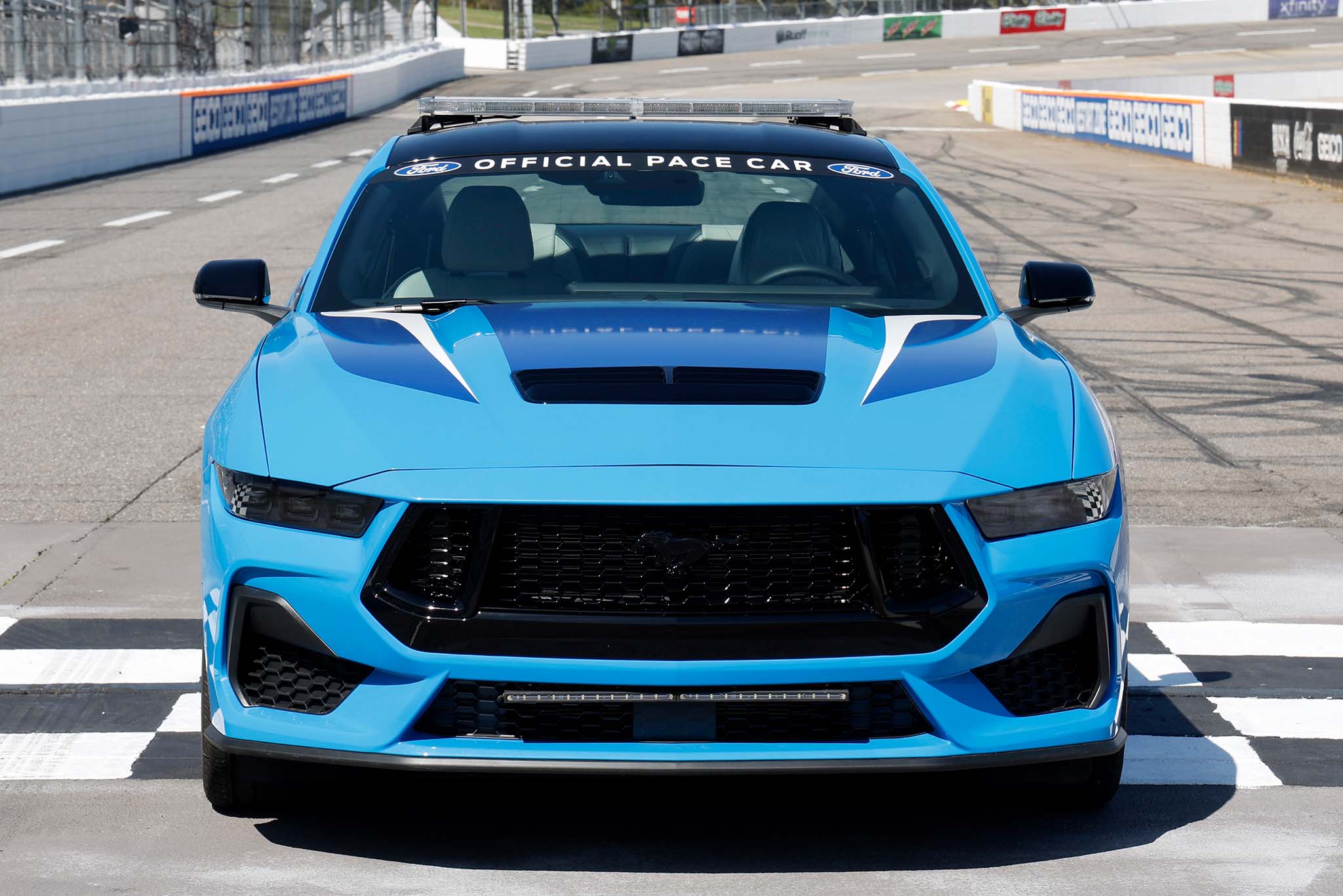 Ford notes the pace car is stock aside from the special graphics and lighting, which you tragically can’t buy at your local Blue Oval dealer. Sad, I know. Still, it fully represents the newly unveiled Mustang with its sharpened, more serious front fascia and angular rear end that sports a sharply creased trunk. There’s no fancy, unobtainable aero or body kit here. Just the same hood scoop, wide fenders, and shallow decklid spoiler you’ll spot on normal production models.