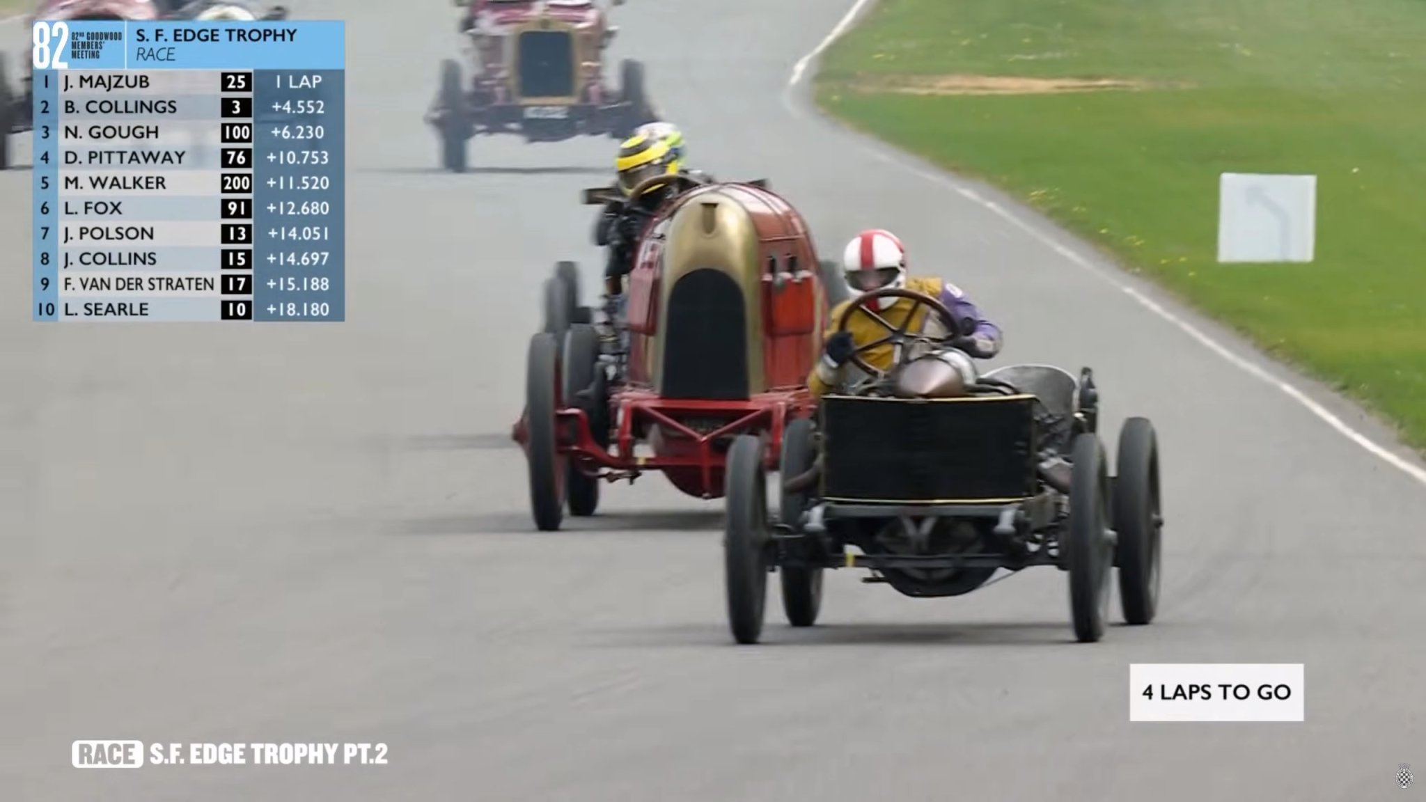 One of the highlights from the practice round is the 1910 Fiat S76, whose 28.3-liter four-cylinder (!) earned it the nickname Beast of Turin. The engine was rated at 290 horsepower, which would have qualified it for the “hypercar” label had the term been around 125 years ago. It shows up at about 1:44 in the video and you can’t miss it. It has the funky proportions you’d expect from a car with such a massive engine.