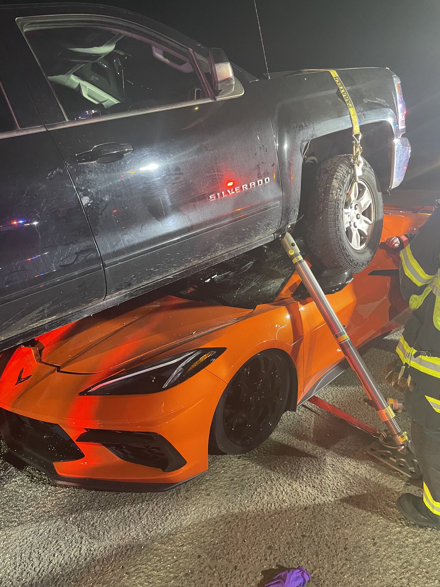 One C8 Corvette owner should feel pretty safe right about now, as a bizarre crash in Thornton, Colorado proved just how strong the sports car really is. According to the Thornton Fire Department, no one in this orange Corvette was hurt, despite the entire cab of a Chevy Silverado sitting on top of it.