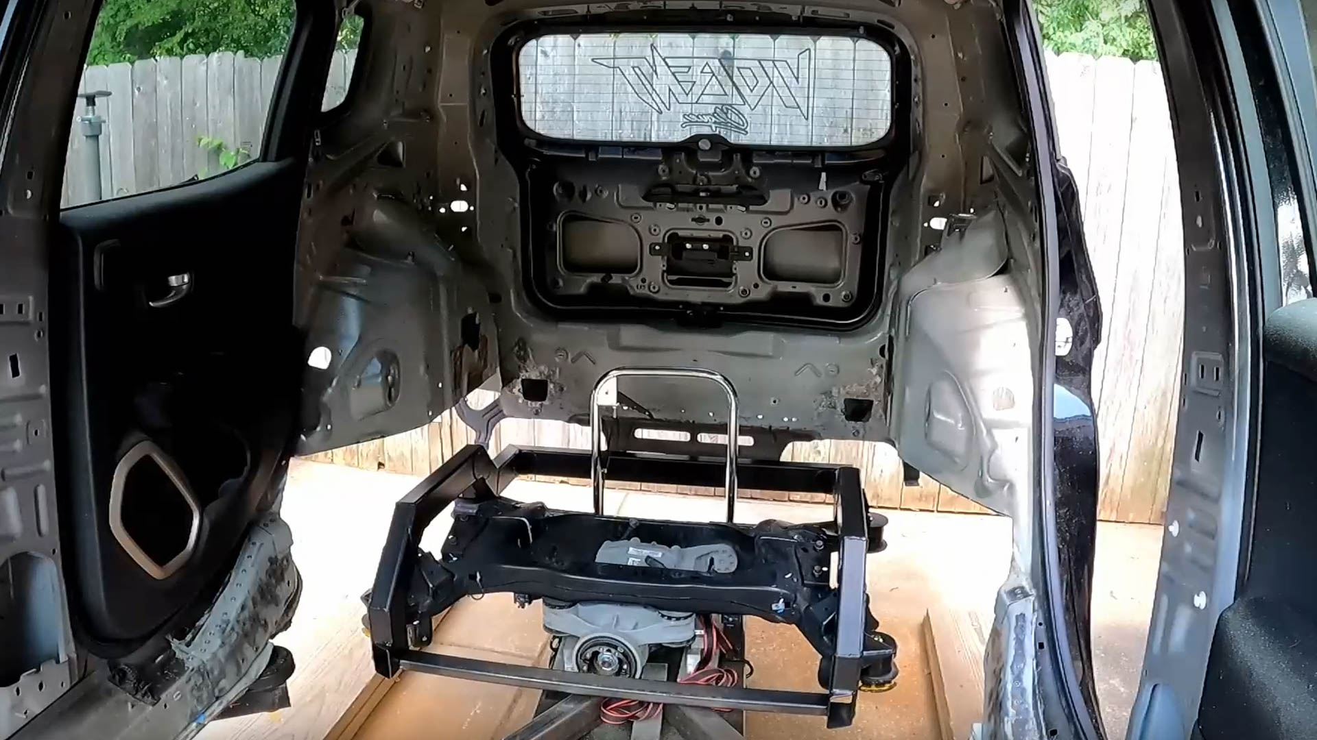 Dropping a 5.7-liter V8 into a front-wheel-drive, transverse-engine crossover that normally packs a 1.3-liter four-cylinder seems nearly impossible. However, Martin was determined to make it come together somehow. The Jeep’s entire floor and both subframes had to be cut out, which left just the body. He then custom-fabricated a rear subframe and cut the front half of the Charger’s floor and subframe out to fit in the Renegade.