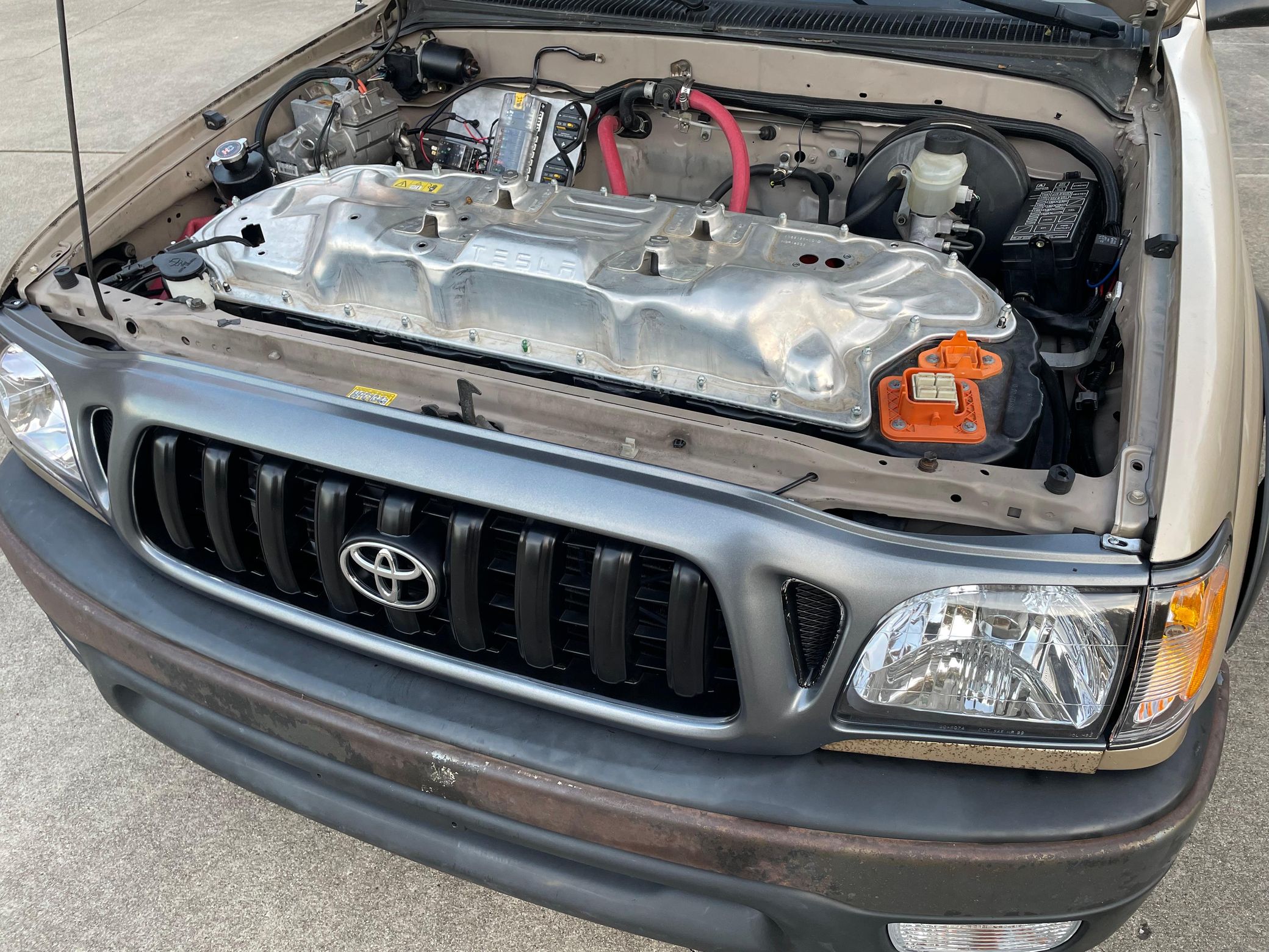 The resourceful Taco fan grew tired of living with the fuel costs of another truck-based Toyota (a fifth-gen 4Runner) after commuting in a Tesla Model 3 for a couple of months, and falling in love with the “addictive” torque and power of the Tesla, in Drew’s own words from the forum post where he introduced his EV conversion. Drew says the Tacoma’s frame and Model 3’s powertrain were compatible—give or take a few frame and suspension mods. After a little custom fabrication and a lot of dedication, the mad scientist ended up with what is likely the first EV-swapped Tacoma ever: