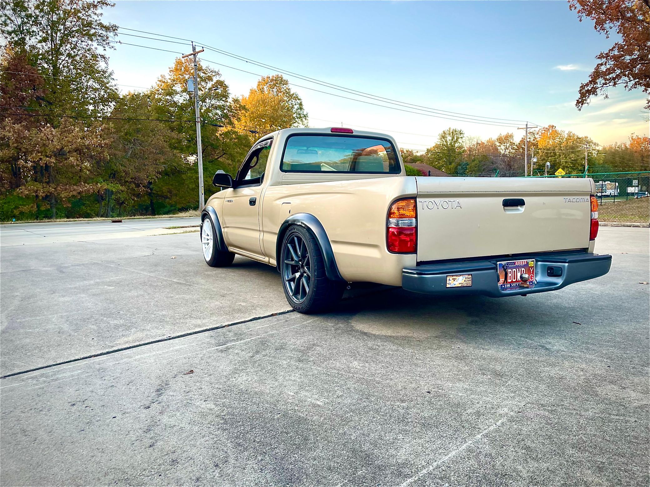 But beyond this Tacoma’s environmental accolades as a car that no longer produces tailpipe emissions, there are other reasons to celebrate the little pickup. It’s a single cab, for starters, which is the platonic ideal of a truck. It’s also tastefully lowered due to the Tesla components, which is fine. And it comes in the classic Mystic Gold Metallic finish, a staple of the first-gen Tacoma, which got two facelifts during its production run—first in 1998, then again in 2001.