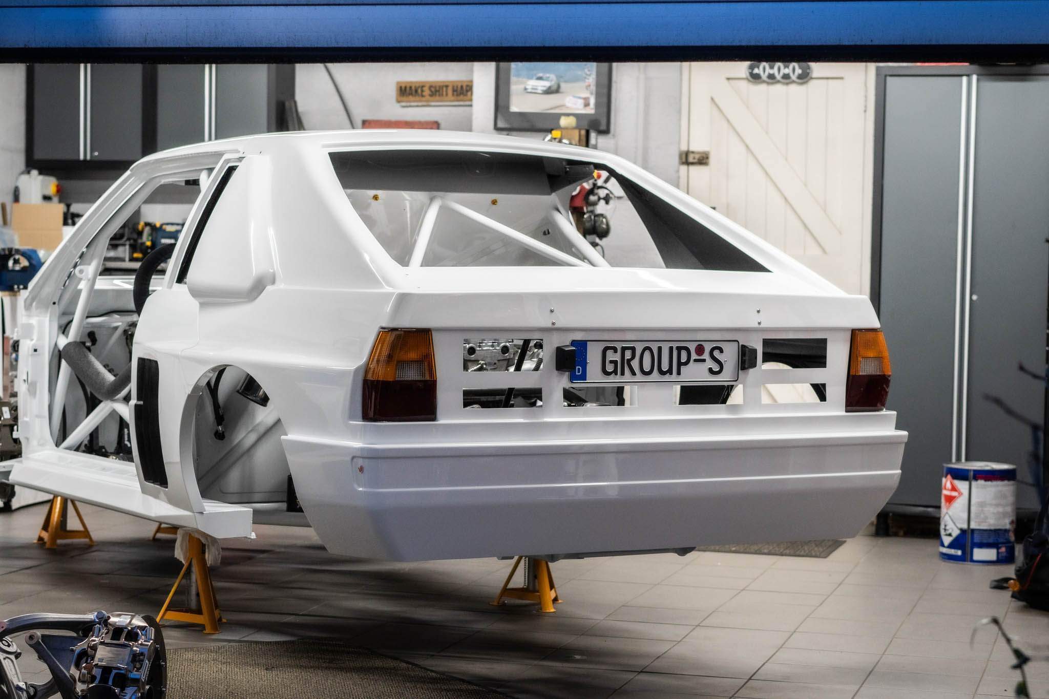 After almost a year’s worth of work, the car is nearly complete; EPS just finished dyno testing and tuning the engine. Since the original rally car used a five-cylinder, that’s what EPS is using, too. It’s a heavily tuned, 2.5-liter turbocharged mill from modern Audi RS cars, and the final tune is rated at 723 horsepower and 500 lb-ft of torque. While there isn’t an official curb weight for it yet, EPS weighed it without the front end on and saw around 2,160 pounds, with almost eight gallons of fuel. So, all put back together and full of fluids, it could realistically be under 2,500 pounds.