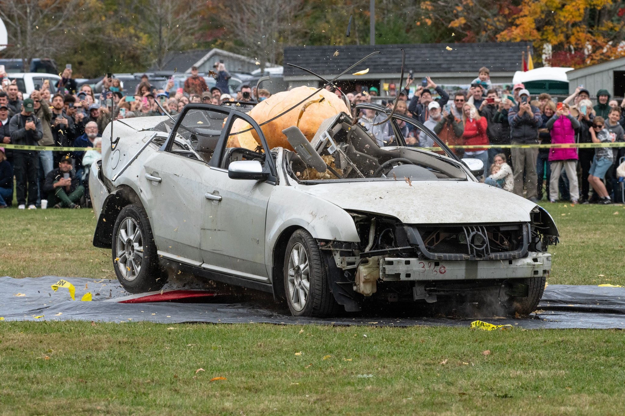 Three, two, one… fight! While the 3,643-pound Mercury has a weight advantage, the pumpkin has gravity working in its favor, which counts for a lot. It falls directly on the Sable, crushing the roof panel, buckling the rear doors, and bending the A-pillars at an angle more commonly seen on supercars than humble, family-friendly sedans. On the flip side, the pumpkin isn’t exactly screaming “Is that all you got?” Its guts splatter in and around the car as it cracks.