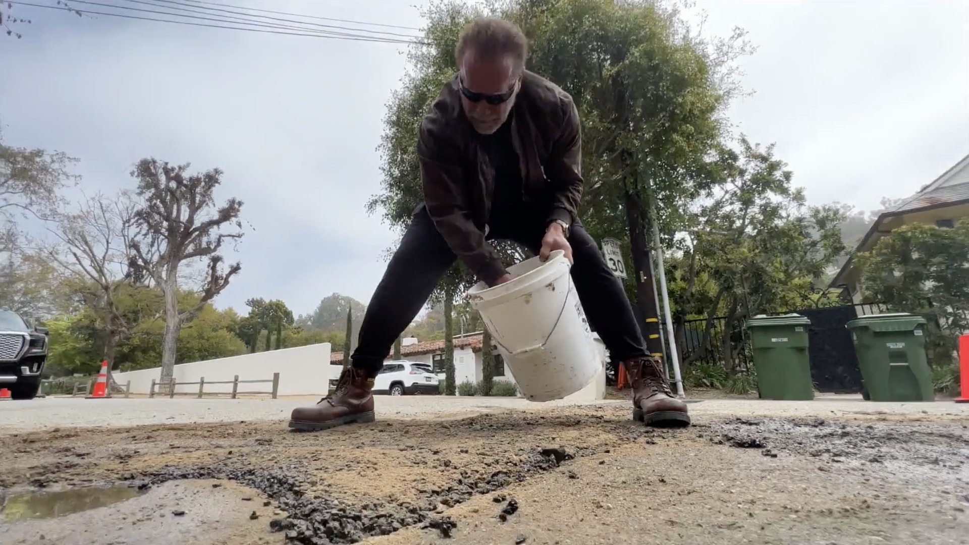 Actor and former California governor Arnold Schwarzenegger released a video of himself filling a hole in his neighborhood’s street after winter storms widely damaged roads in California.