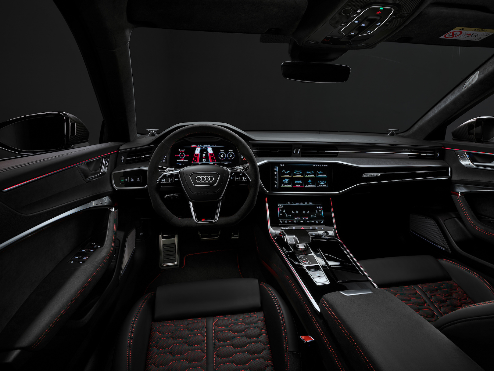 For starters, Audi amped up the cars’ shared 4.0-liter, twin-turbo hybrid V8 by 30 horsepower and 37 pound-feet of torque, for a total of 621 hp and 627 lb-ft. That goes through an eight-speed automatic transmission to Quattro all-wheel drive with an improved center locking differential, now lighter and smaller. It sends up to 60% of the torque rearward by default but can split it up to 70% front or 85% rear based on wheel slip.