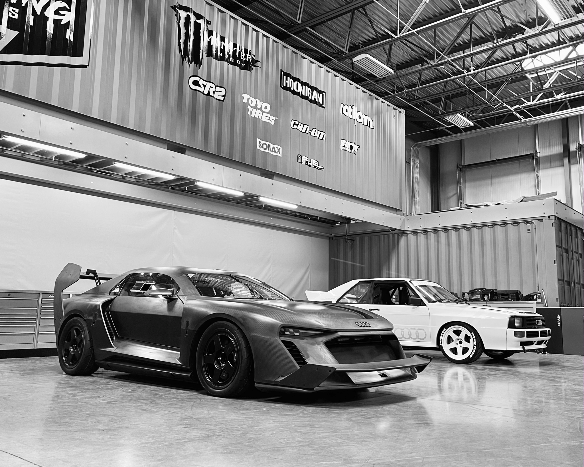 The Hoonitron first debuted in a red-and-grey Audi livery. However, that was just for the car’s debut photo shoot, with Hoonigan preparing its own livery for the upcoming Gymkhana film. Thus, it had to be peeled off, revealing the bare carbon underneath.