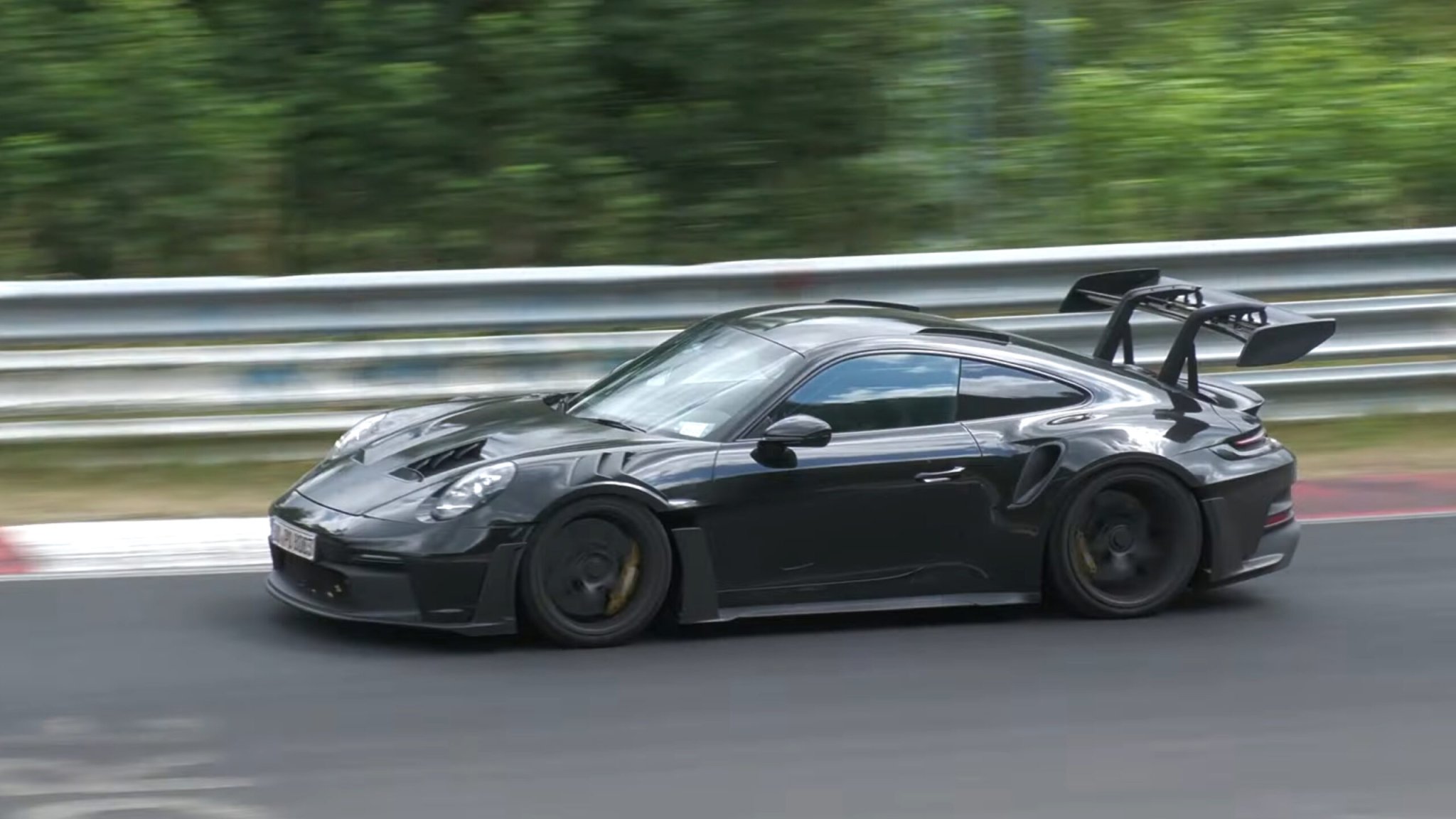 YouTube’s CarSpyMedia captured Porsche’s newest RS car ripping around undisguised during an industry pool test session on the Nordschleife, and it looks like one hell of a track weapon. The exterior is packed with wild aerodynamic mods: fins along the roofline, huge air scoops in the rear wheel arches, big air vents through the hood, and a massive rear diffuser, among other things.