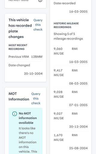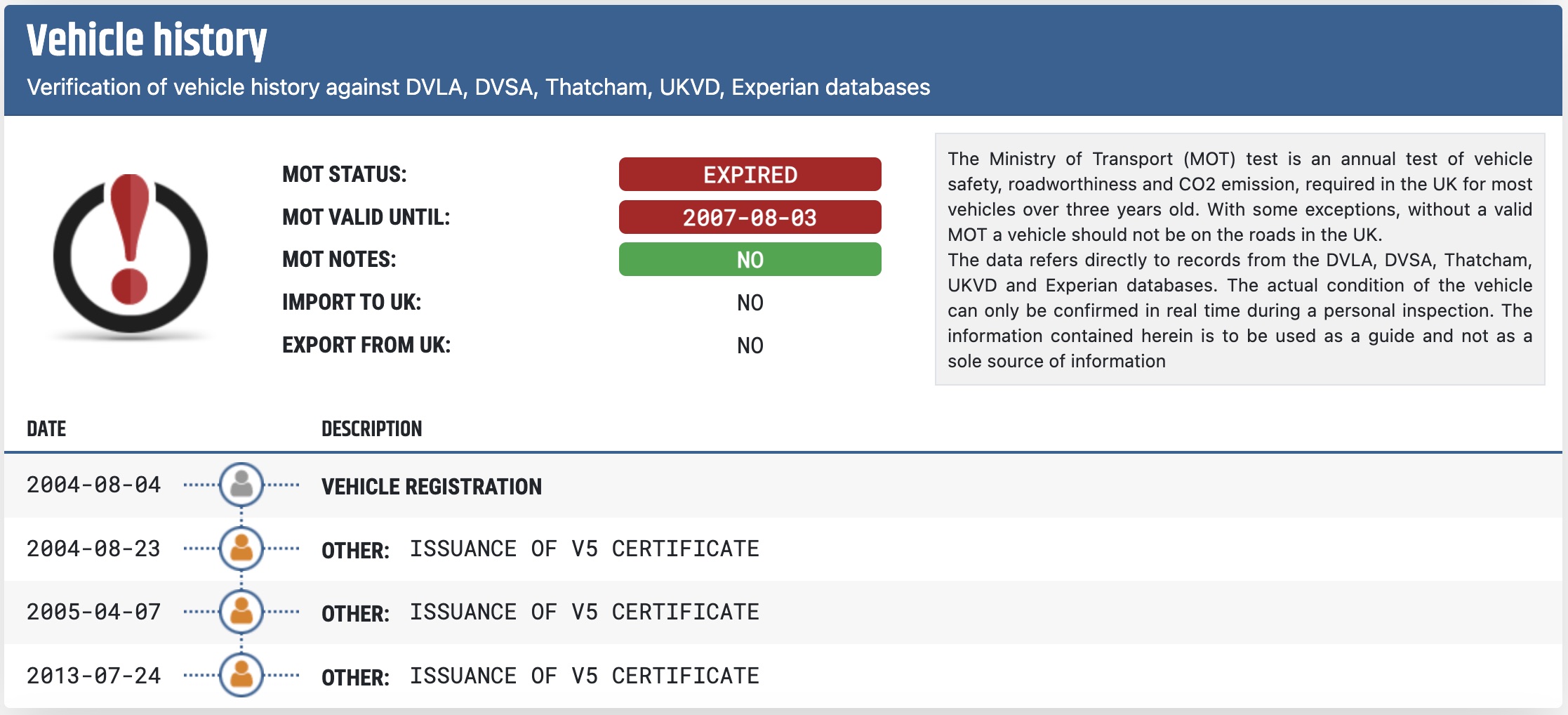 To start with, I pulled vehicle history reports from Britain’s free Driver and Vehicle Licensing Agency, and paid reports by HPIcheck.com, and uk.vin-info.com. This allowed cross-reference of reports associated with the plate and one specific to the VIN (which I was asked not to publish). All sources agreed that the CSL was registered in August 2004, but didn’t undergo MOT inspection, leading to its plates expiring in March 2006.