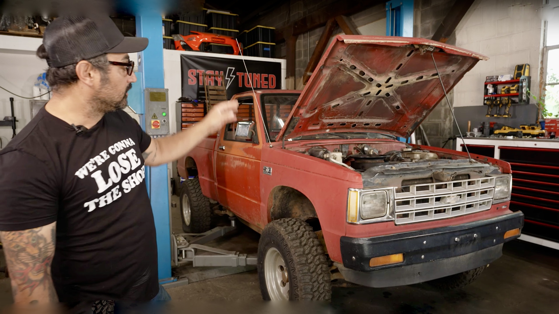 Angelo stripped back the S10, pulling out the truck’s original 2.8-liter engine in the process. The cab and bed were also yanked off to make working on the rig easier. It makes a lot of sense given that most of the drivetrain has to be pulled off and swapped over.