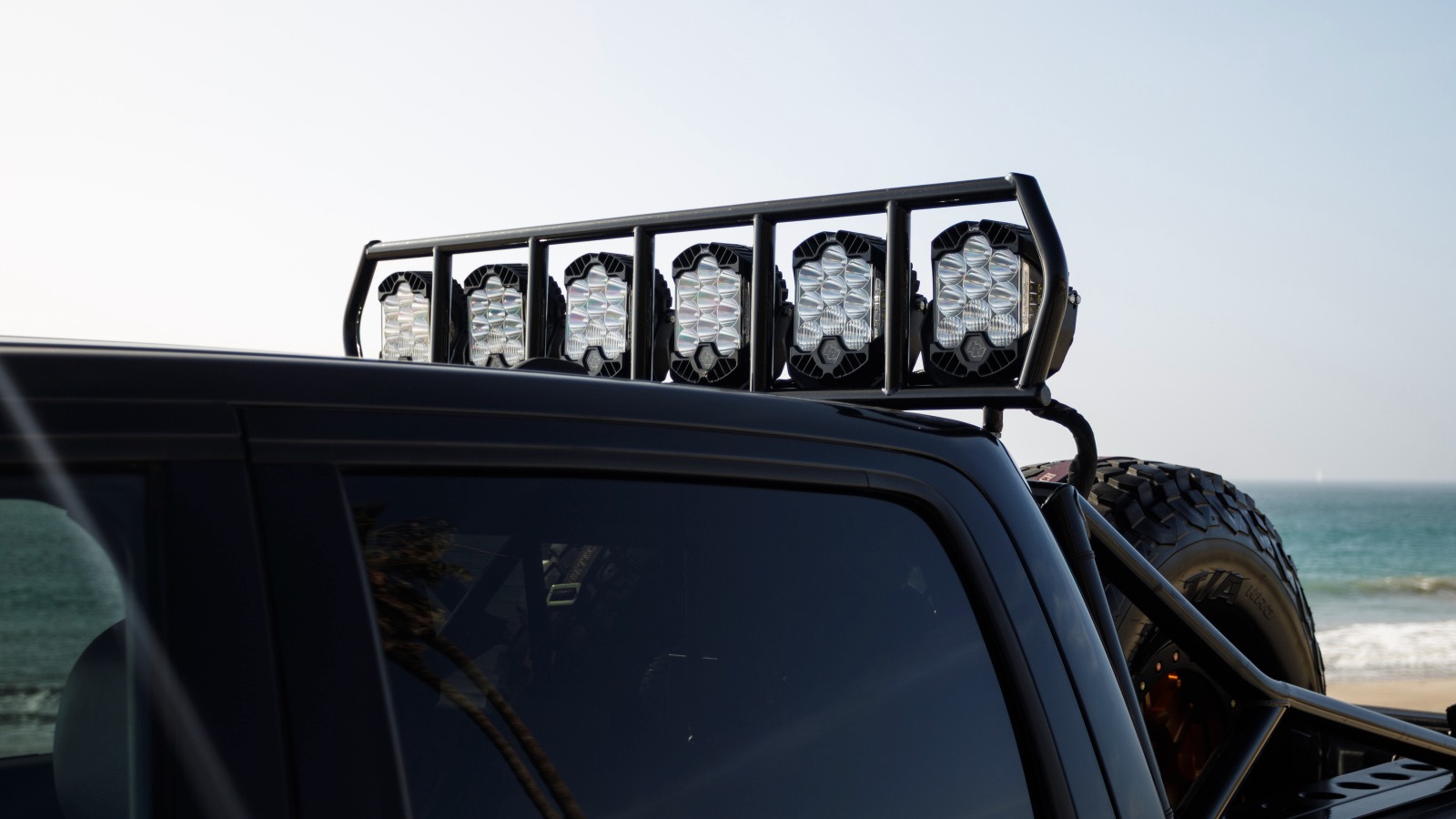 The movie truck also has an engine cage, which helps strengthen the frame while providing a mounting point for the taller aftermarket shocks, as well as custom-fabricated fenders that make room for 40-inch BFGoodrich KR3 tires, and a cooling system stuffed further up under the bodywork to increase the approach angle. A light bar and bed-mounted spares complete the desert-racer look, while added skid plates and a fuel cell ensure the TRX isn’t just for show.