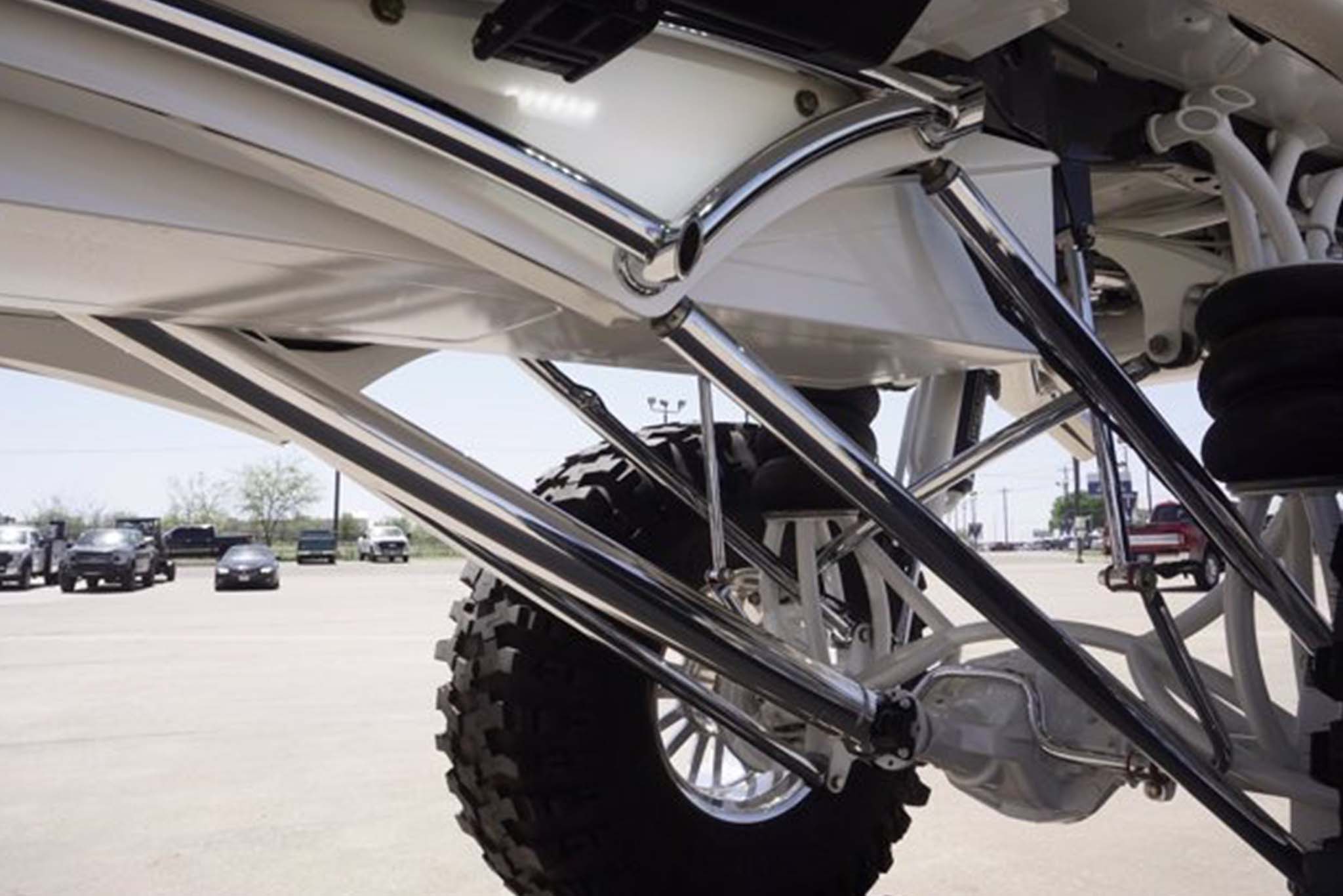 You can see a host of artistic drop brackets and reinforcements that support the mega 58-inch Mickey Thompson tires and King shocks with 18 inches of stroke. There’s also a lot of onboard air supply to keep the adjustable suspension’s bags filled up, and they can also be let down at the flip of a switch that’s mounted on the center console. These are the type of setups that cost as much as a truck all on their own.