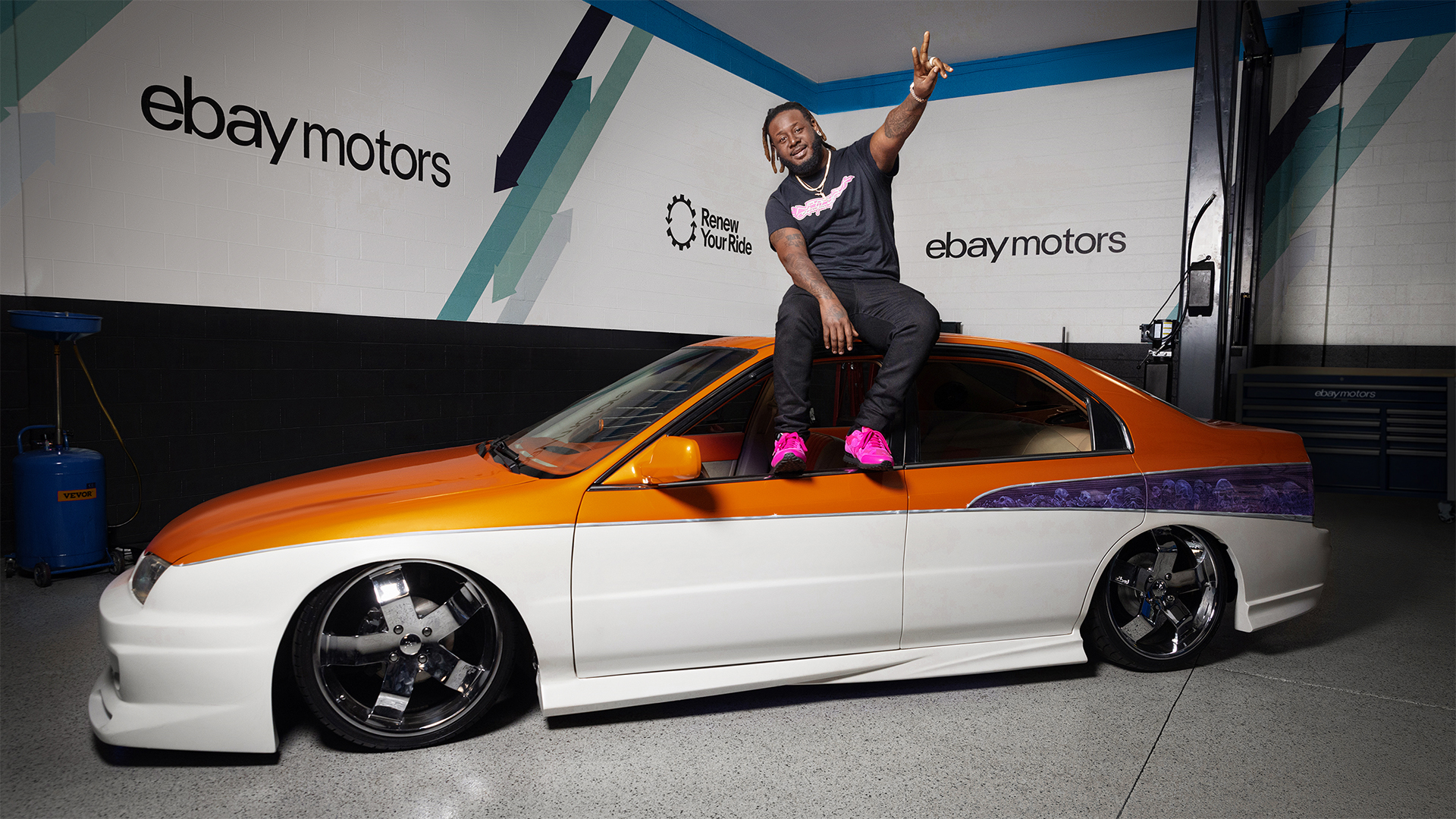To prove this whole Guaranteed Fit thing is legit, eBay Motors got with T-Pain and our friends at Donut to fix up his Accord with a number of needed maintenance items and overdue upgrades. Quick backstory on the car, the “Bel-Cord” as T-Pain calls it. He bought it off a friend back in 2006 with the vision of making an homage to a 1956 Chevy Bel-Air. It’s also got a custom single-piece body (only the hood, doors, and trunk are separate panels) and air suspension—plus like any 30-year-old car, plenty of deferred maintenance.