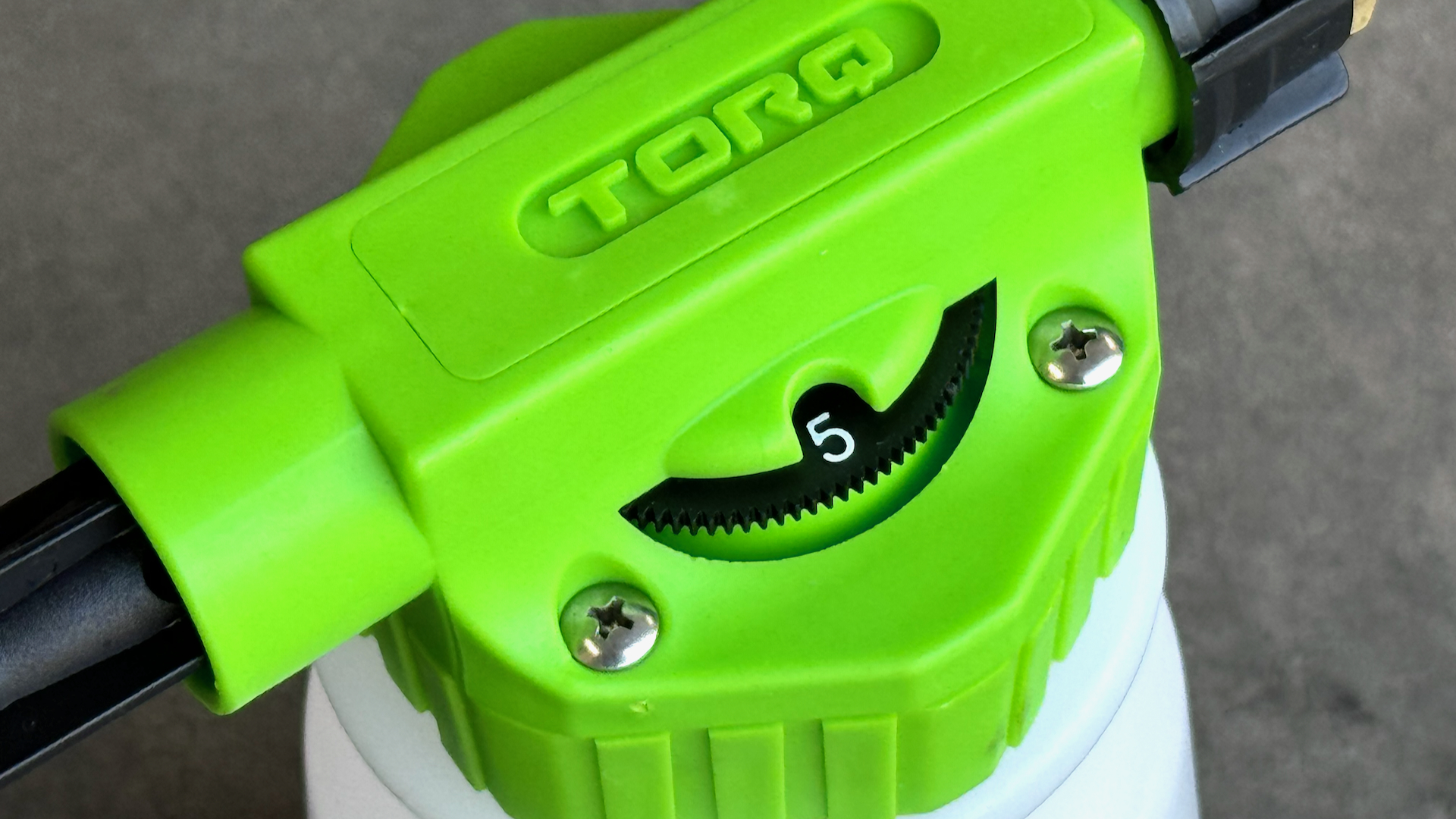 The Foam Blaster 6 works well for operating off a garden hose. I didn’t expect pressure washer results. It has an adjustment for the amount of soap it’s pulling from the 32-ounce soap tank. I found the highest setting works best. You add a couple of ounces of soap, there’s a fill line on the bottle, and dilute it with water.