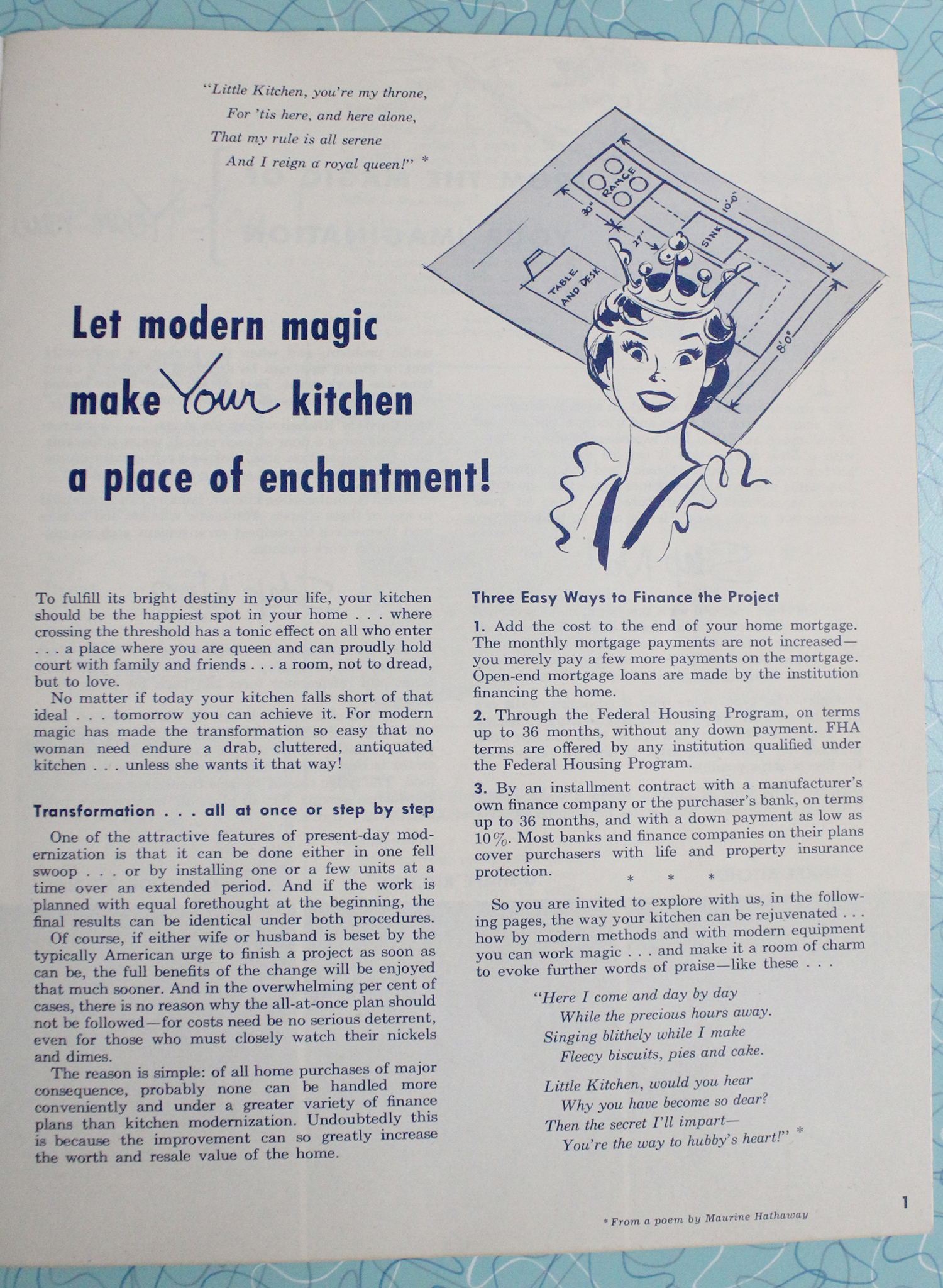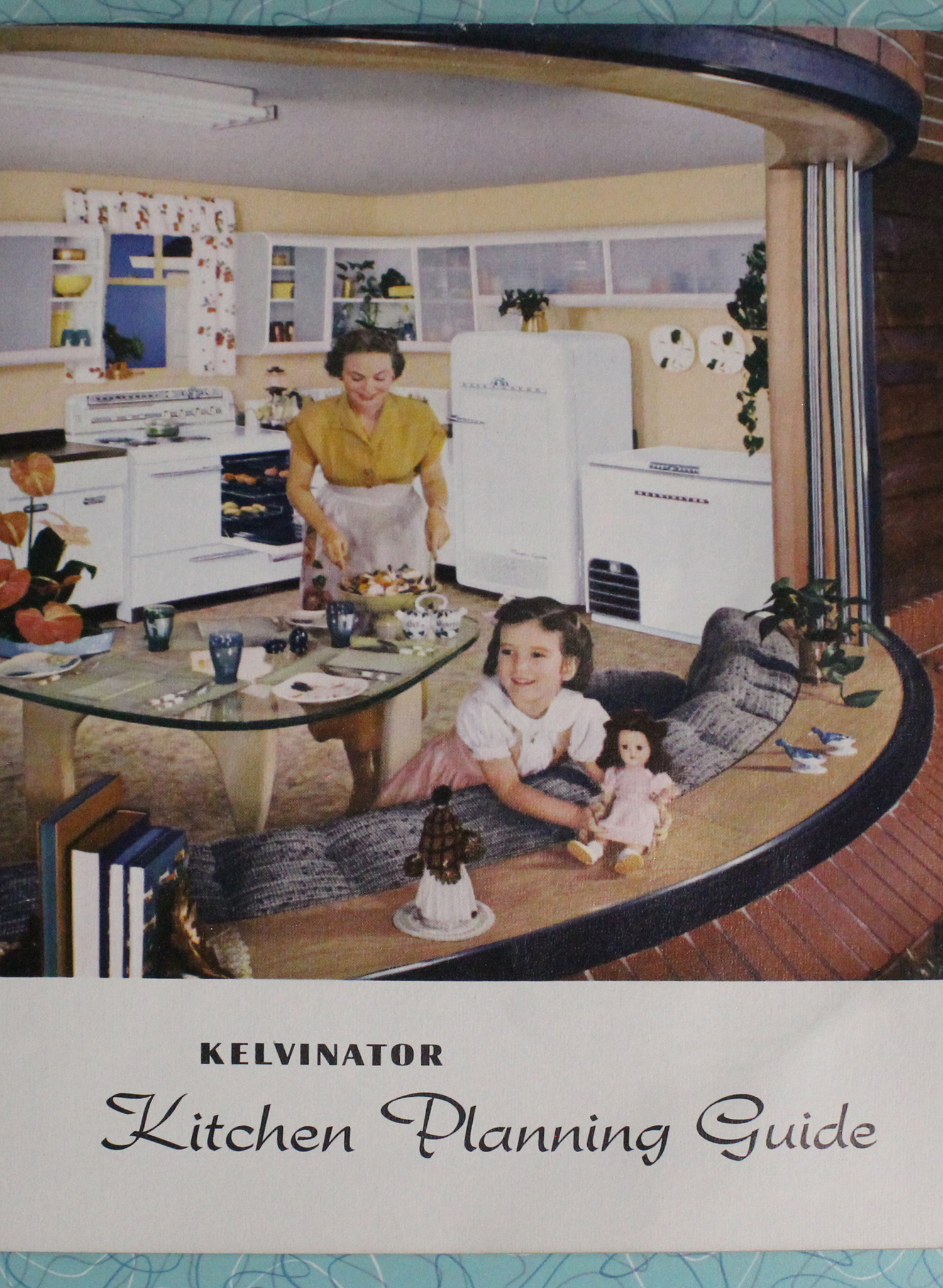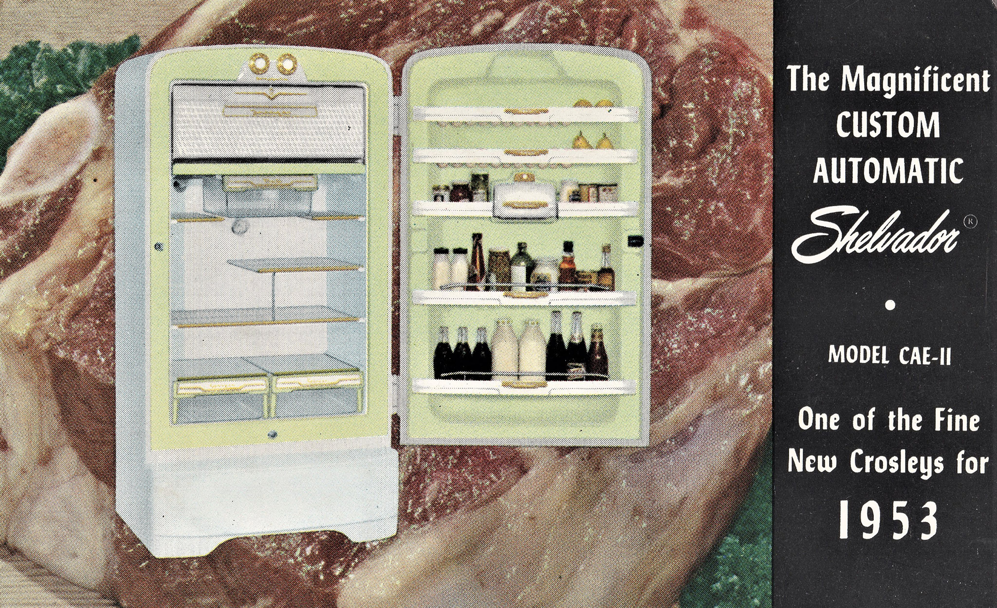 Of course, people were looking to fill their nice new houses with new appliances and new cars in their driveways, and corporations were eager for their slice of the market. Still wholly owned by GM, Frigidaire innovated with new fridge features like auto-defrost and new colorful designs. Kelvinator launched a line of steel cabinets to go with their existing equipment, making it possible to build an entire kitchen with Kelvinator-branded products. Appliances became fancier, with catchy names like “Foodarama” and gorgeous designs that looked more like art-deco movie theaters than a place to store butter and eggs.