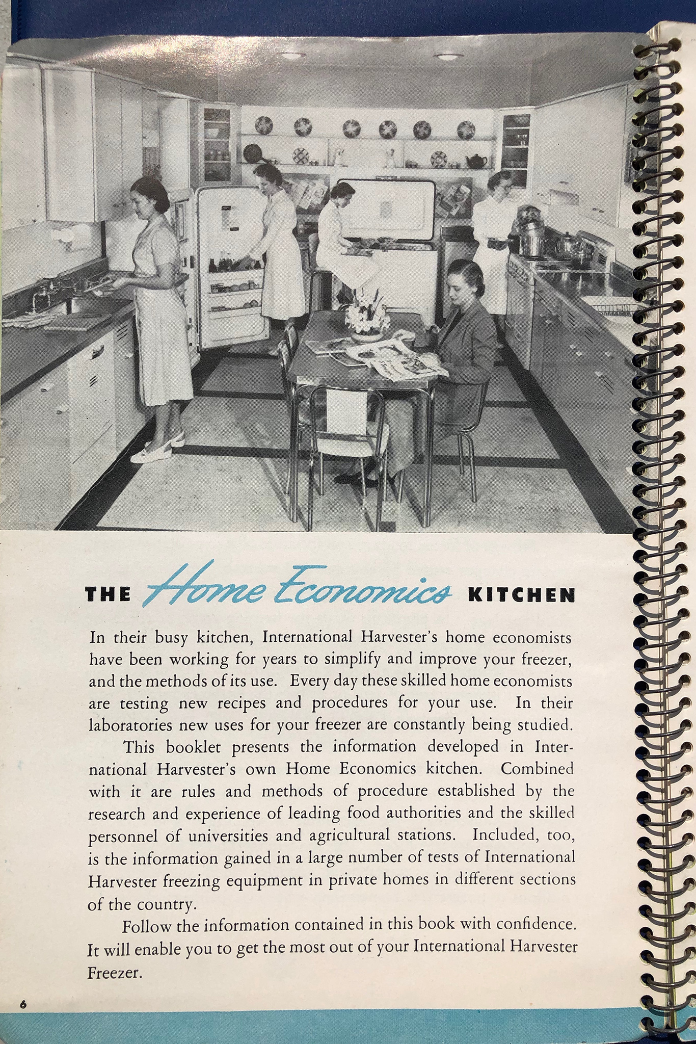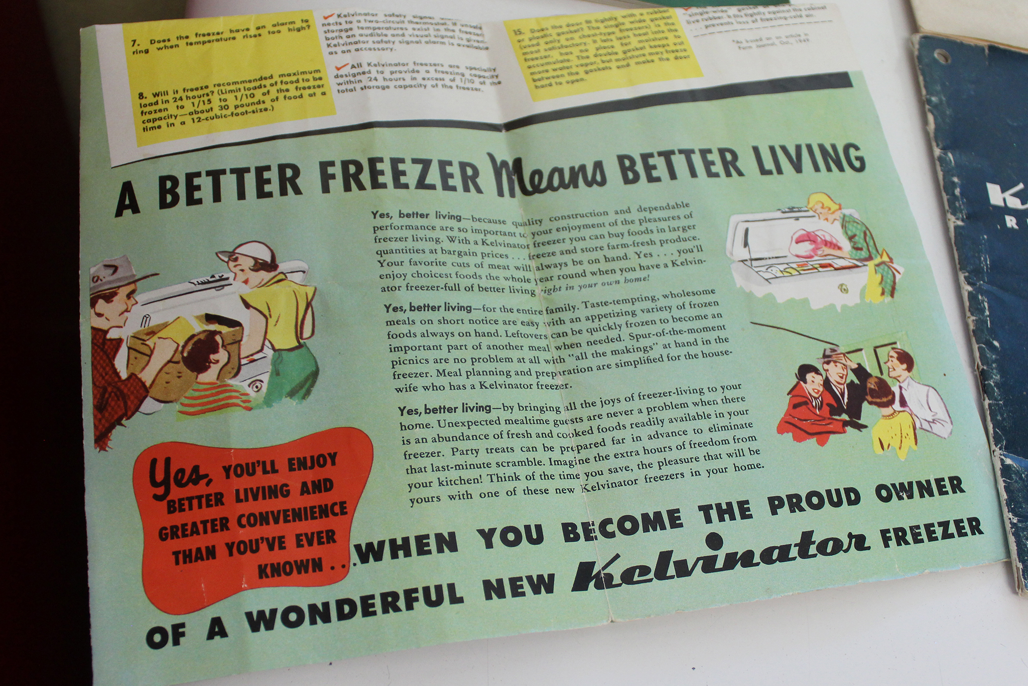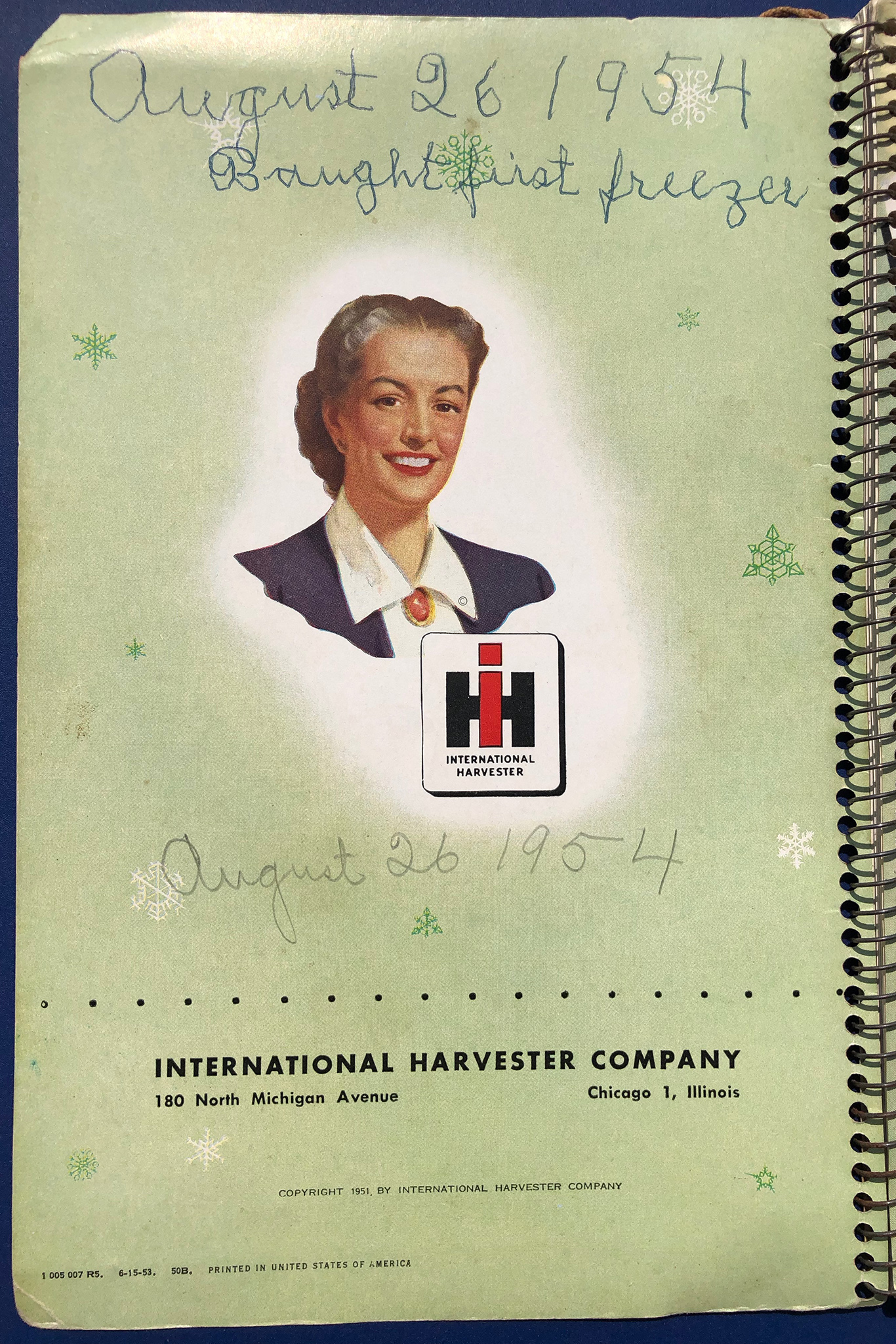 Fictional spokeswoman Irma Harding appeared in colorful ads, encouraging home cooks to give up the laborious process of hot water canning and switch to freezing their vegetables instead. IH hired dozens of saleswomen to drive around the country and promote the ease and benefits of freezing produce to rural audiences. It all sounds a little hokey, but to families not used to the convenience of electric refrigeration, there was a genuine learning curve. (Note the photo of the pamphlet with the handwritten note saying the family bought their first freezer in 1954!)