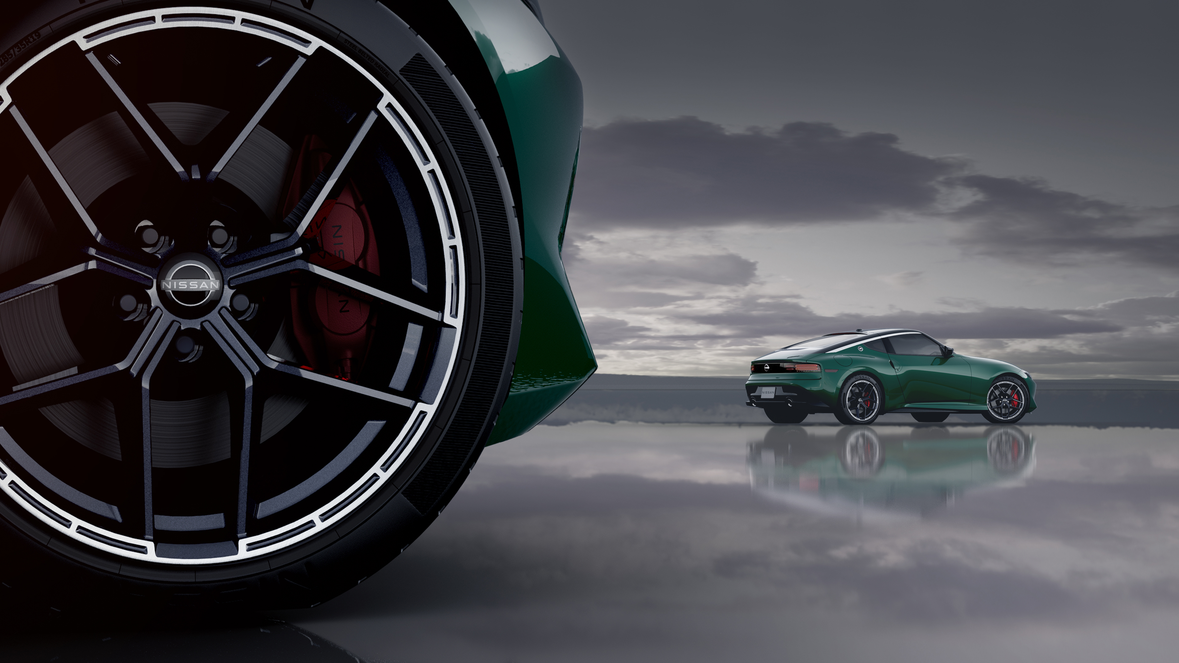 And here’s what it will look like. If you hated the old grille, well, good news: You can safely put that behind you. The new nose speaks more directly to the Z’s sharply creased hood, carrying that line naturally into the front bumper. The 10-spoke wheels and green finish are also new.