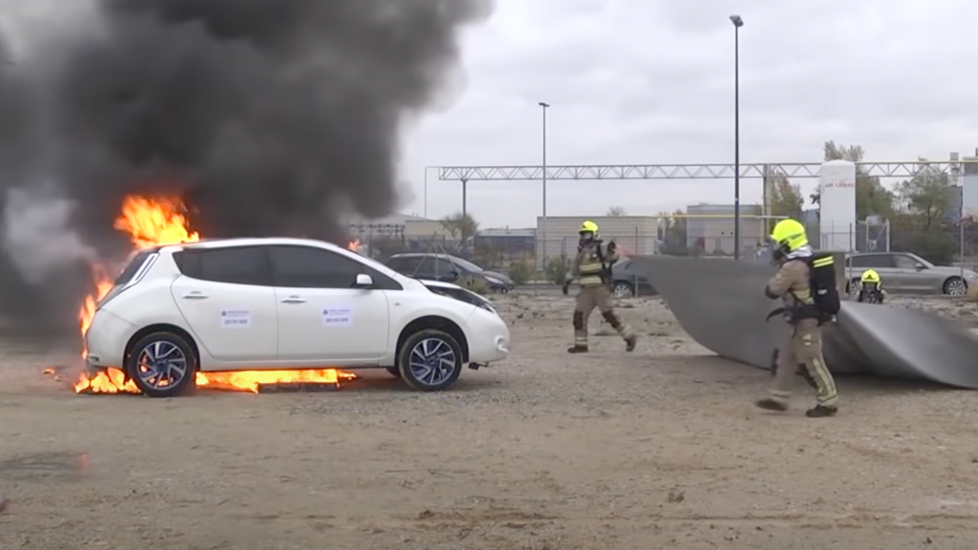The video comes from Centro Zaragoza, Spain, where a fire department tested a Bridgehill fire blanket, which is designed specifically for car fires. For the test, they torched a Nissan Leaf, whose fire eventually reached 1,976 degrees. At that point, they brought out the blanket and covered the car. In under 30 seconds, thermal imaging showed that the fire’s temperature dropped to 676 degrees. After a few minutes, it dropped to 248 degrees.