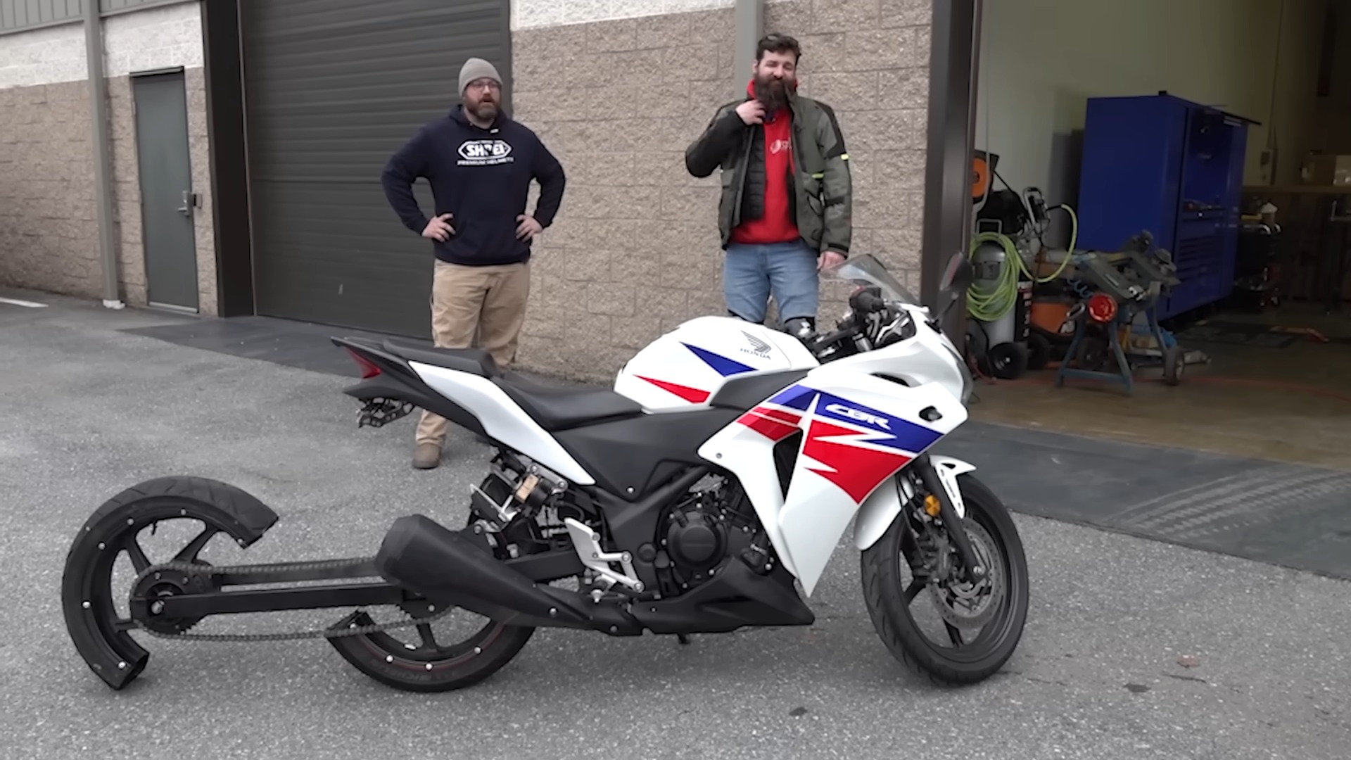 The build starts with a Honda CBR250. The lightweight starter bike was fitted with an extended steel swingarm in order to mount an extra rear wheel cribbed from another CBR250. A chain was used to drive the second rear wheel from the first. As a three-wheeled bike, it rode well in testing. At this point, the real challenge began, however. The team had to figure out how to make the bike run with two rear half-wheels instead.