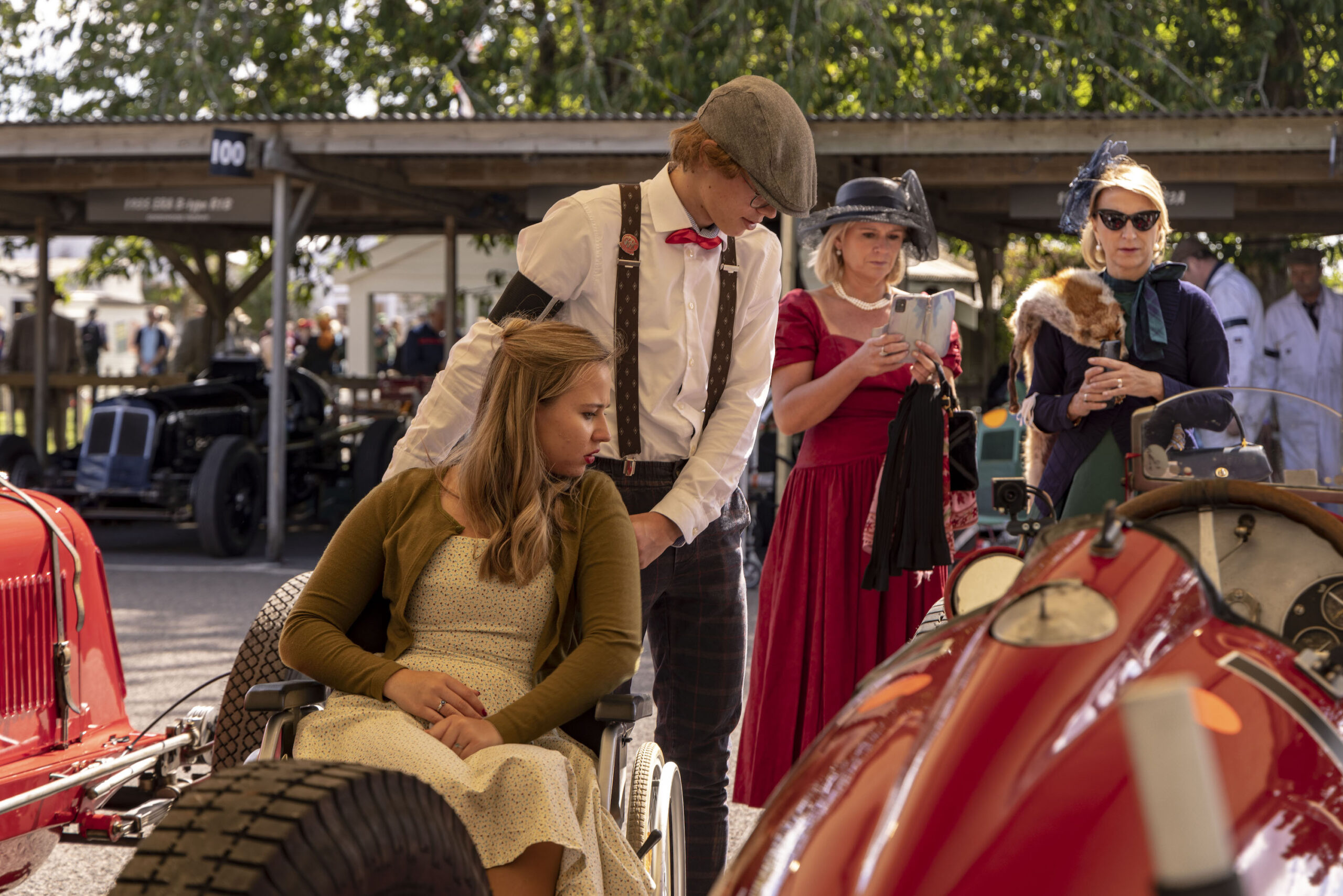 For background, the Goodwood Revival is an annual three-day motorsport and culture festival that takes place at the historic Goodwood Motor Circuit. Cars and motorcycles that would have raced at the circuit during its original operative years between 1948 and 1966 are welcome, so the vehicles all date from between the 1930s to the mid-1960s. Period-correct dress—fashions spanning between the ’40s, ’50s, and ’60s—is also highly encouraged.
