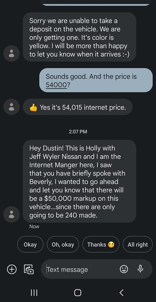 Dealership markups on a hotly anticipated enthusiast car like the new Nissan Z were pretty much expected but one particularly egregious-sounding case has turned into a bit of a messaging mess. A post on “The New Nissan Z” Facebook group surfaced Tuesday documenting a text message exchange with an employee at Jeff Wyler Nissan of Louisville who informed a prospective Z buyer of a $50,000 markup since “there are only going to be 240 made.”