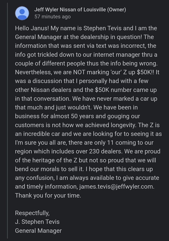 According to dealership general manager Stephen Tevis who subsequently chimed in via email, in the comments of the Facebook post, in a New Nissan Z forum thread on the topic, and in direct messages with The Drive, the alleged $50,000 markup was a miscommunication.
