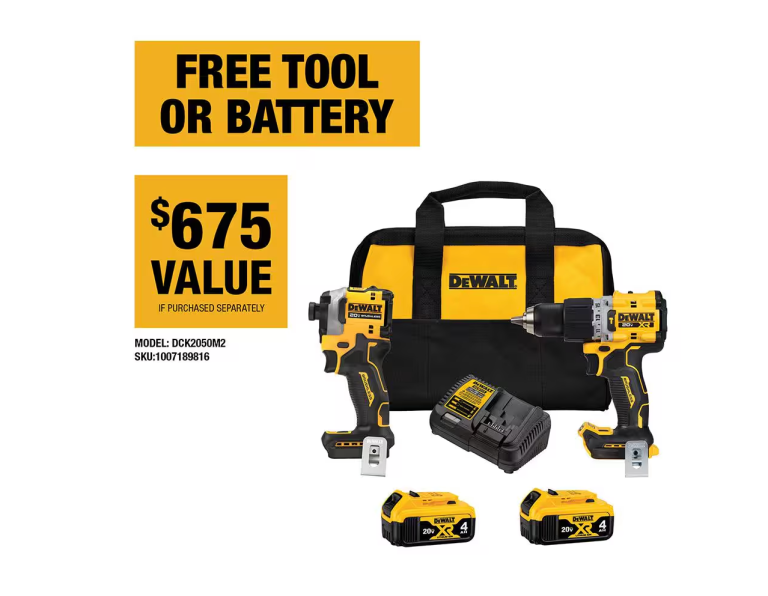 - DeWalt 20V MAX XR 2-Tool Cordless Combo Kit for $299.00 Plus Free Gift