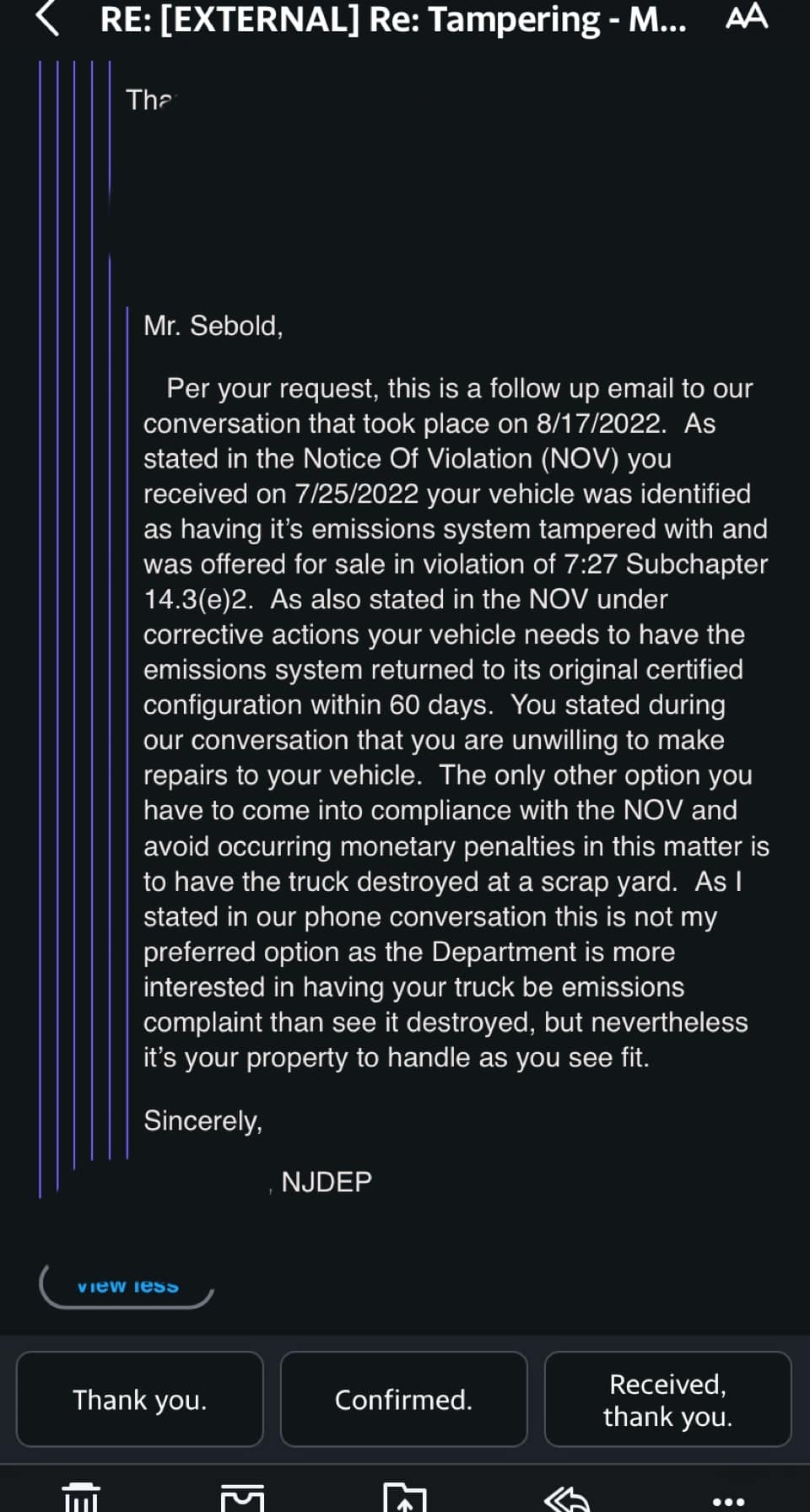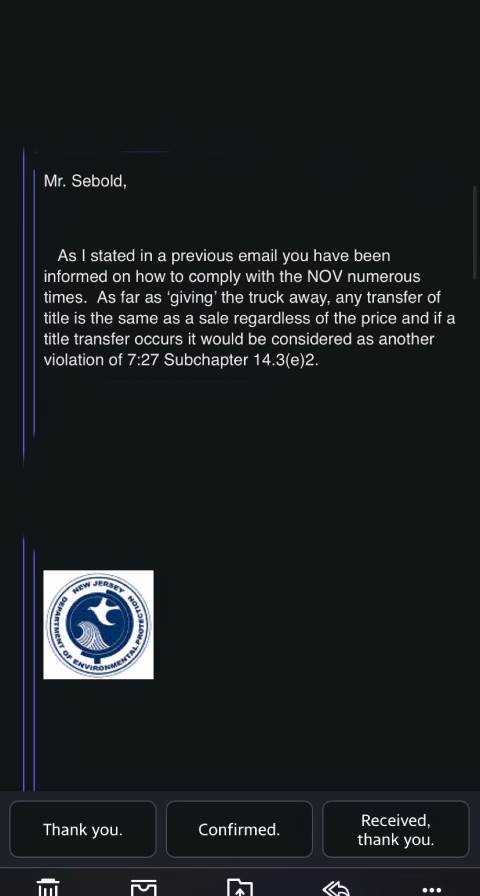 Sebold’s saga has gained a ton of attention on social media, with reactions split between anger over perceived government overreach and outrage over deleted trucks in general. His initial Facebook post, which has since been shared more than 3,000 times, mentioned the letter sent to him by the New Jersey DEP two months ago. The department gave him a 60-day deadline that ends Sept. 25, and he told me “there’s no way” they were going to give him an extension. As such, he set the appointment to crush the truck nine days early.