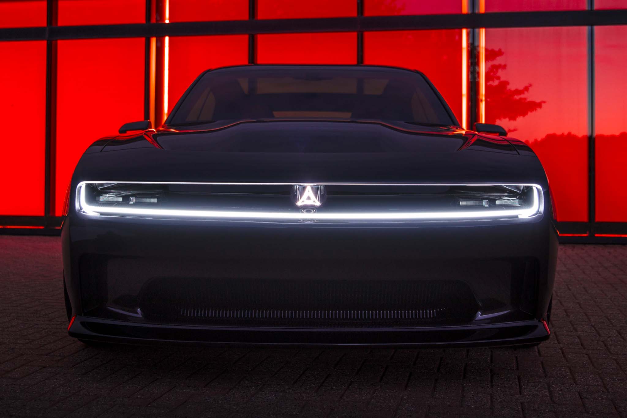 The concept’s interior is further distinguished by features that favor utility and comfort more than its V8 predecessors. Its rear seats fold flat to make the most use of the rear hatch, and there’s a panoramic sunroof. The biggest touchscreen in Dodge history (oof) at 12.3 inches is angled 10 degrees toward the driver, who also benefits from an 8-by-3-inch head-up display.