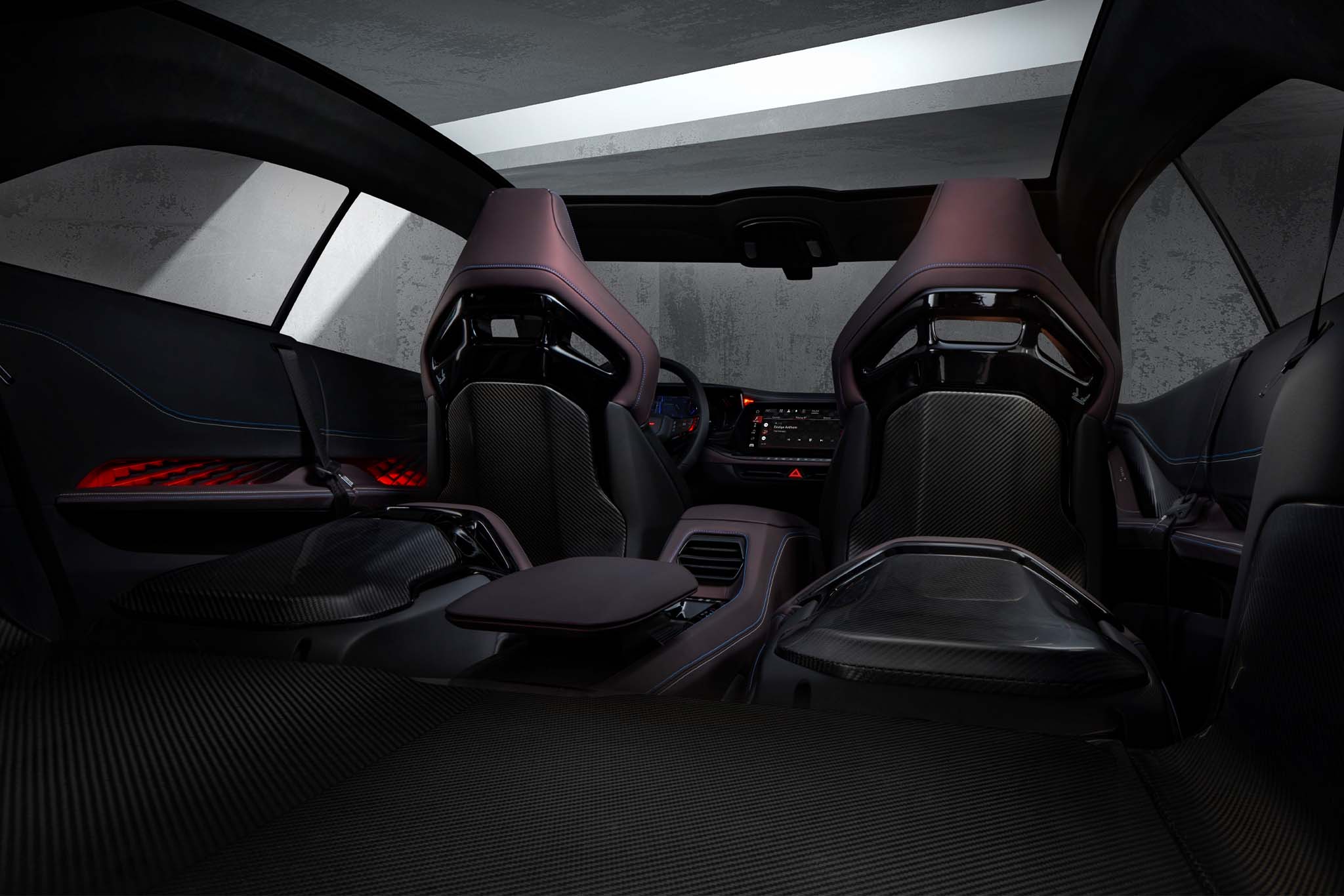 What’s definitely functional are its six-piston brake calipers, mounted behind 21-inch wheels with center lugs and a turbine-inspired design. The jet motifs continue in the interior, where there’s a fighter jet-inspired starter button obscured by a flip-up cap and a pistol grip-style, trigger-equipped shifter. It’s still got paddle shifters, too, and buttons to change drive modes between Auto, Sport, Track, and Drag. With a “carbon fiber ‘tub’ floor,” the Charger EV should be more than up to any of those kinds of driving.