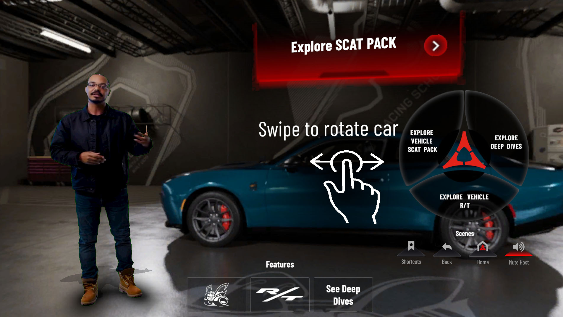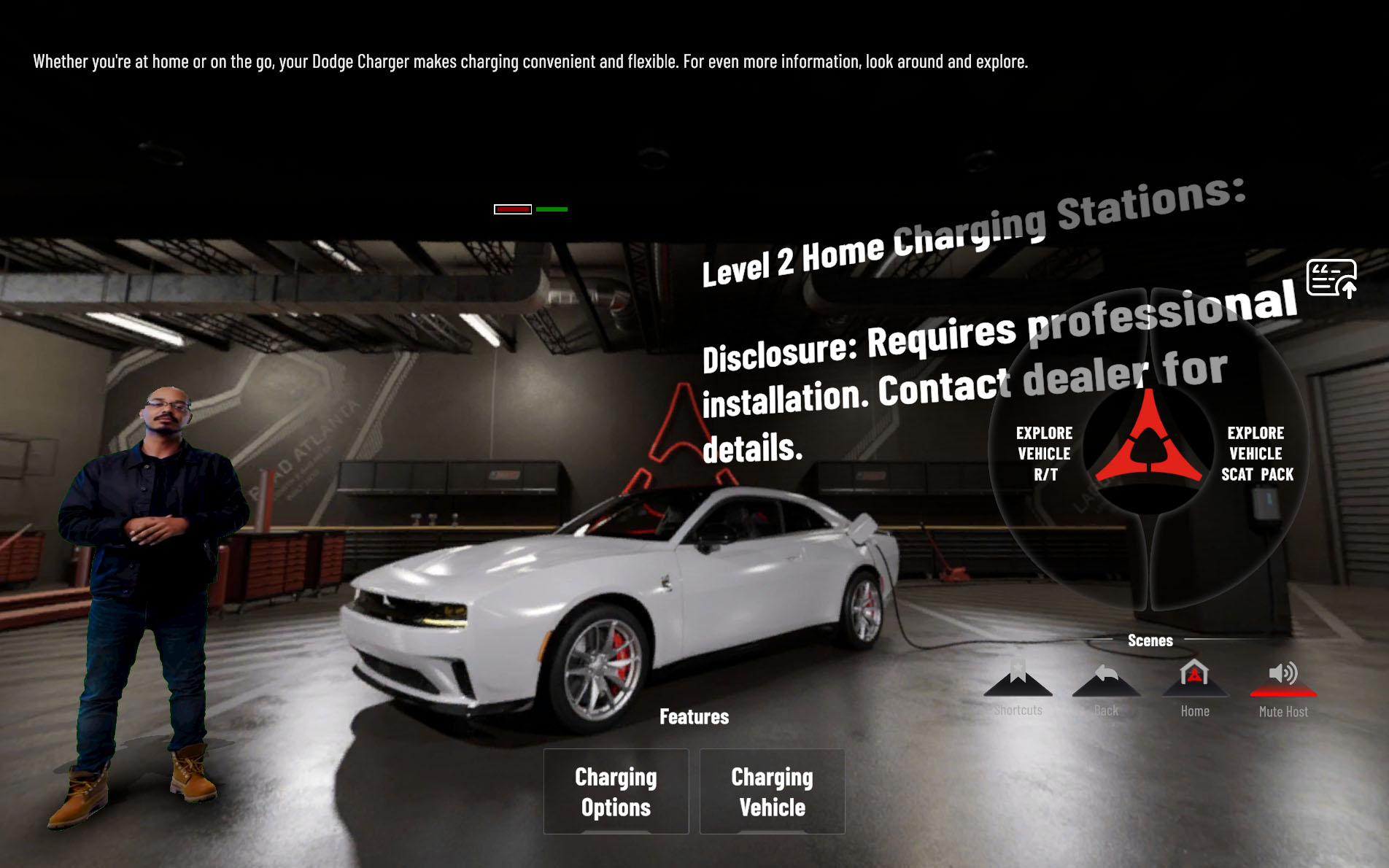 Visit DodgeChargerPortal.com right now, and the first thing you’ll be faced with is a loading bar, followed by an engine start button to click, and then another loading bar. Once through those, you’ll see what we’re working with here: Dodge has made a virtual showroom of sorts where you can learn about the new Charger EV. There’s Garrett, our host who’s been poorly isolated in front of a green screen; a blurry JPG of a Charger that can be rotated by click-dragging, and a room to pan around in.