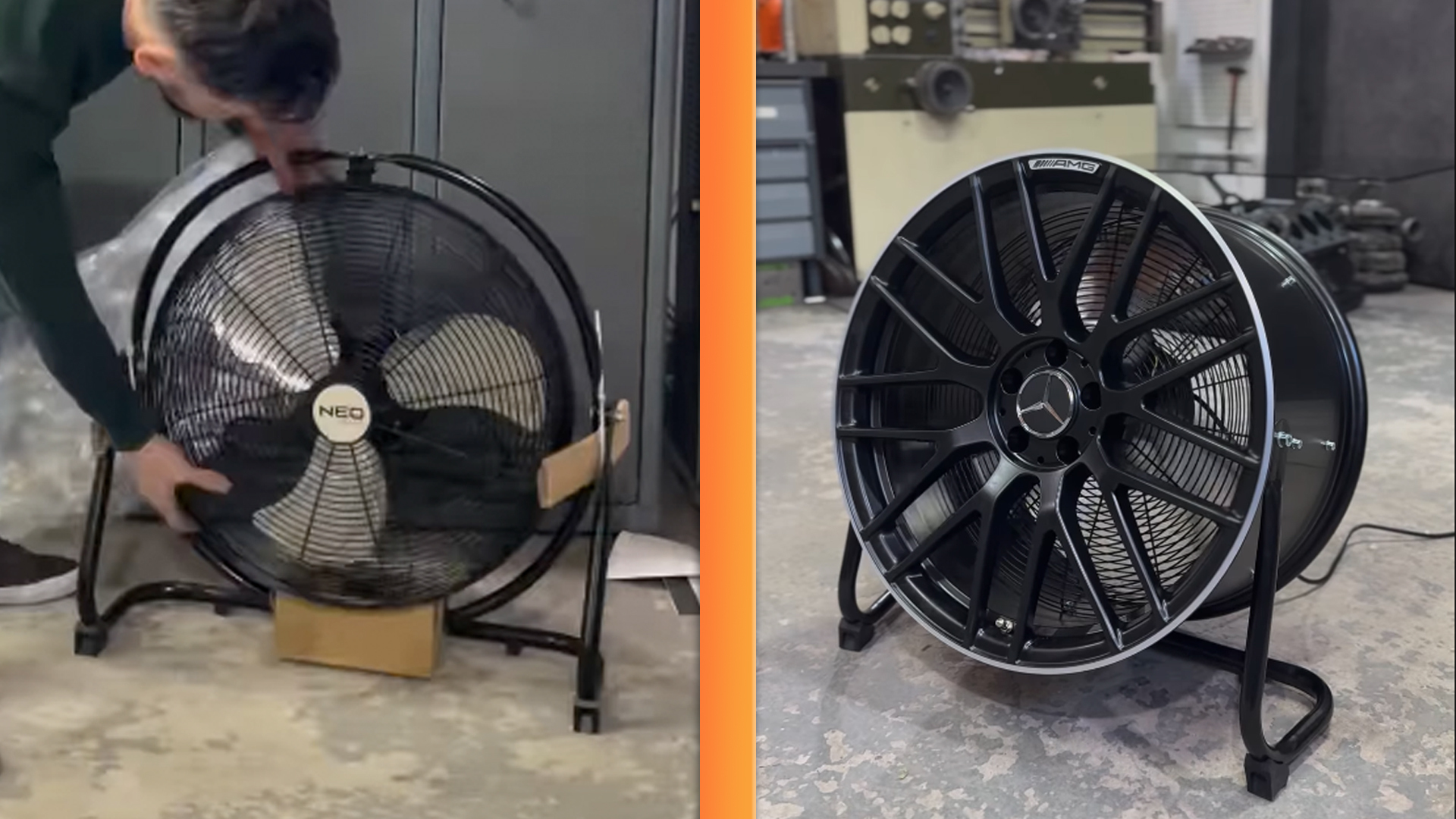 Metal Works Studio detailed the process in a short video published on Instagram. The shop sourced a standard floor fan that you can get from just about any retailer, and a 20-inch matte black alloy wheel that presumably came from an AMG. The builder disassembled the fan and trimmed the front grille so it fit inside the wheel. Next, it drilled holes in the sides of the wheels to mount the grille and the fan’s original stand. This is very much a “measure twice and cut once” type of job, especially when you consider the price of an AMG wheel.