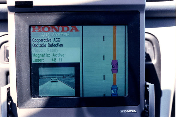For starters, there was the Ohio State University Center for Intelligent Transportation Research. CITR tested two Honda Accords that were developed and tested at the Transportation Research Center in Marysville, Ohio. The Hondas were outfitted with laser range finders, optical cameras, and radars which would center the vehicle in the lane using reflective strips. These strips were fit to a section of I-15 for the test.