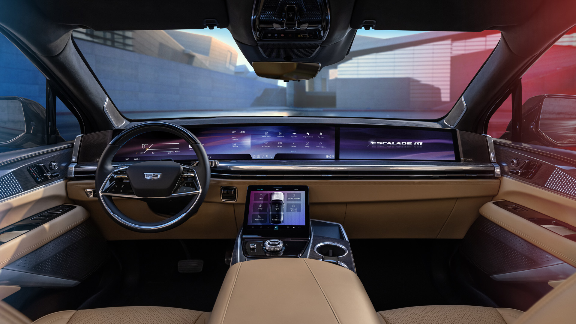 The interior as a whole takes cues from modern architecture with the aim of making the already-huge cabin feel bigger than it is. There’s a fixed-glass panoramic roof, which does a lot of the lifting. Then Cadillac incorporates subtle touches like intricately laser-etched wood throughout the cabin that show just how much special attention was paid to the Escalade IQ.