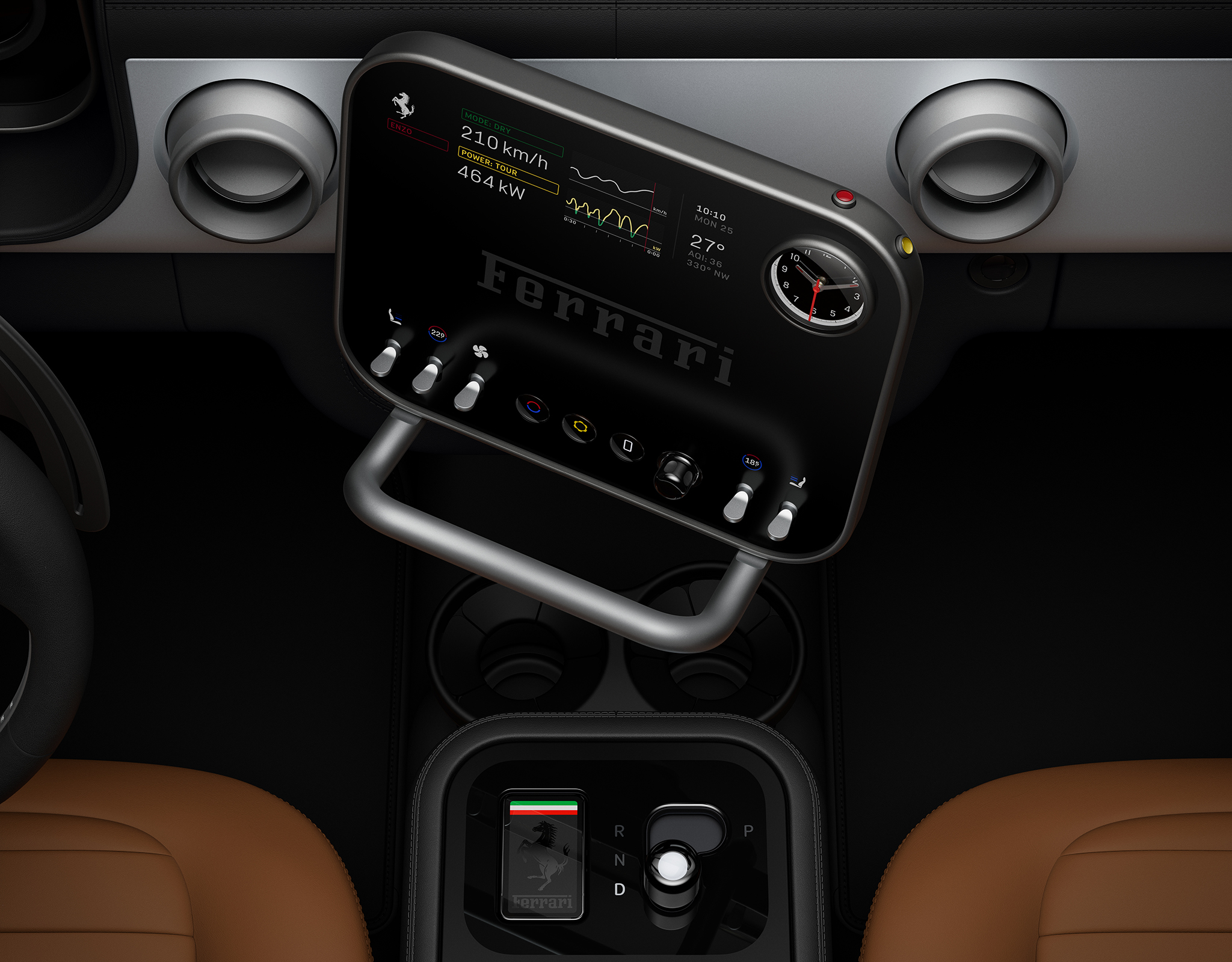 I didn’t get to see the software in action, though its operation smooth and crisp in the demo video Ferrari played at the event. Instead, we heard a lot about the physical clock in the upper right corner. Apparently it was quite a challenge to create a zero-maintenance movement that could allow all three hands to move 360 degrees independently in less than one second, as required for the transition to its stopwatch or compass functions. That’s what the two buttons on the bezel are for. Notably, the clock’s gears are some of the only pieces of plastic in the entire cabin.