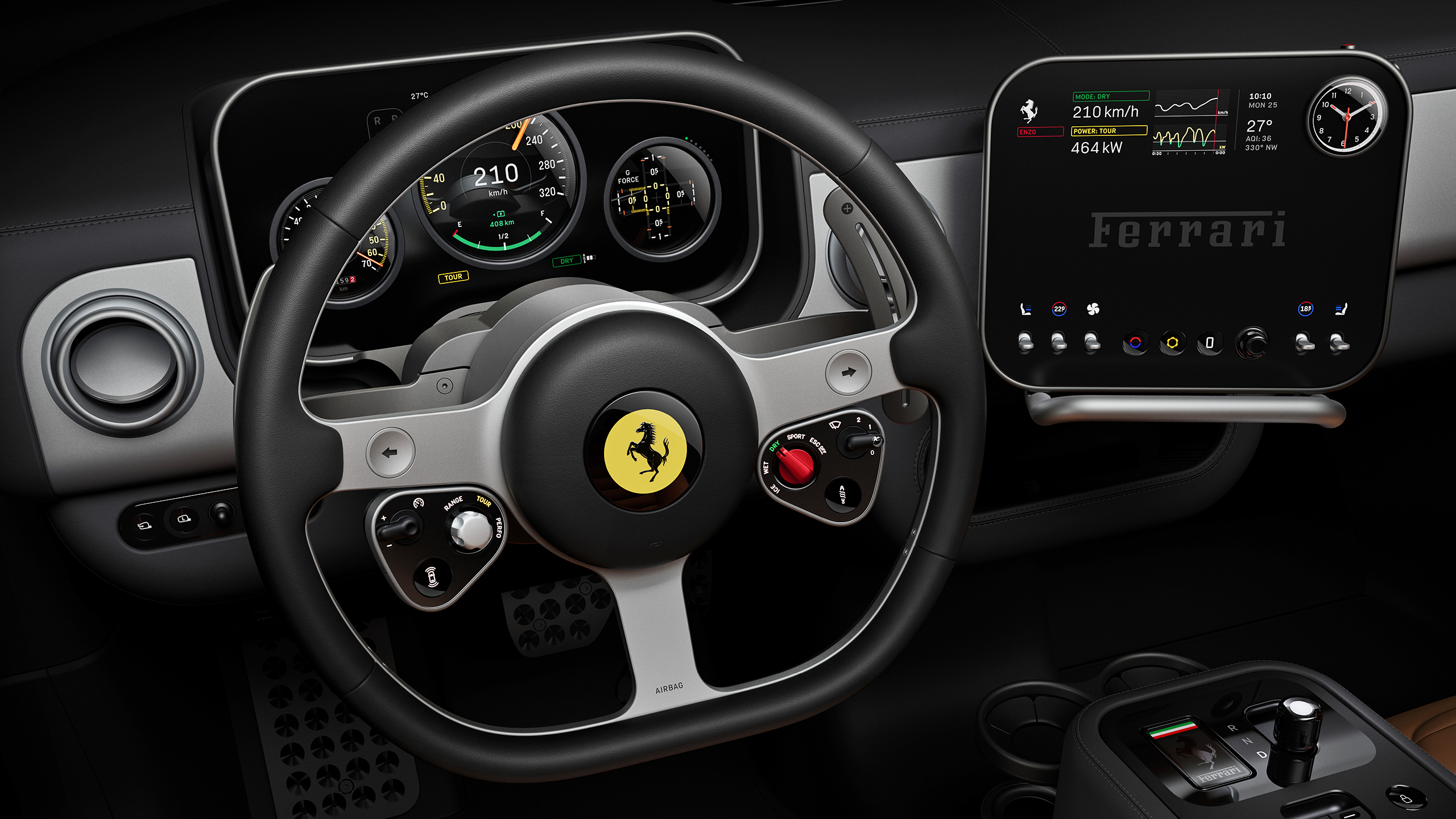 Two large column-mounted paddle shifters sit directly behind it, which will be used to change the Luce’s Torque Shift Engagement system. Ferrari really doesn’t want to call it fake shifts, instead focusing on how grabbing a paddle will change the car’s entire torque curve, but functionally, it’s going to be fake shifting.