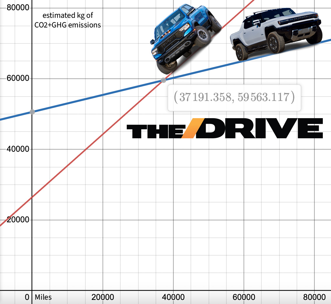 It takes just under 37,200 miles to achieve parity with a TRX, at 59.6 metric tons of CO2 emitted over the total life cycle, and finally, it’s all gravy for GM from there.