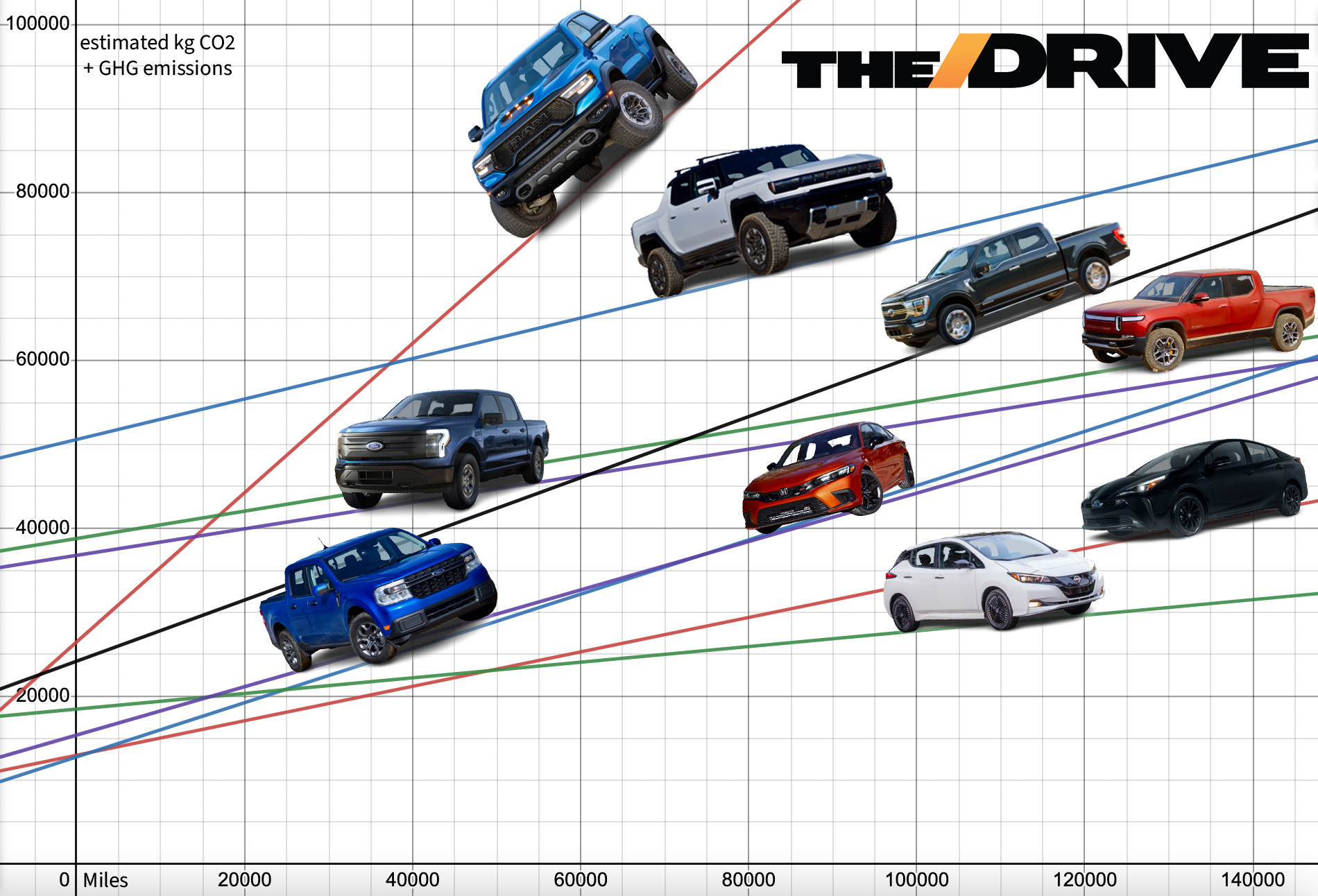 Down there at the bottom are a selection of economy cars with differing drivetrains, including the regular Honda Civic, the hybrid Toyota Prius, and electric Nissan Leaf, with the hybrid Ford Maverick thrown in for the hell of it. Interestingly, while the Civic and Maverick track each other over the first couple hundred thousand miles (reaffirming my belief that the Maverick is a Corolla-killer in disguise), and hover around the Hummer’s CO2-per-mile, their comparatively tiny size and manufacturing impacts mean their lines never converge. And it’d take over 140,000 miles for them to catch up to the tamer Rivian R1T and Ford F-150 Lightning.