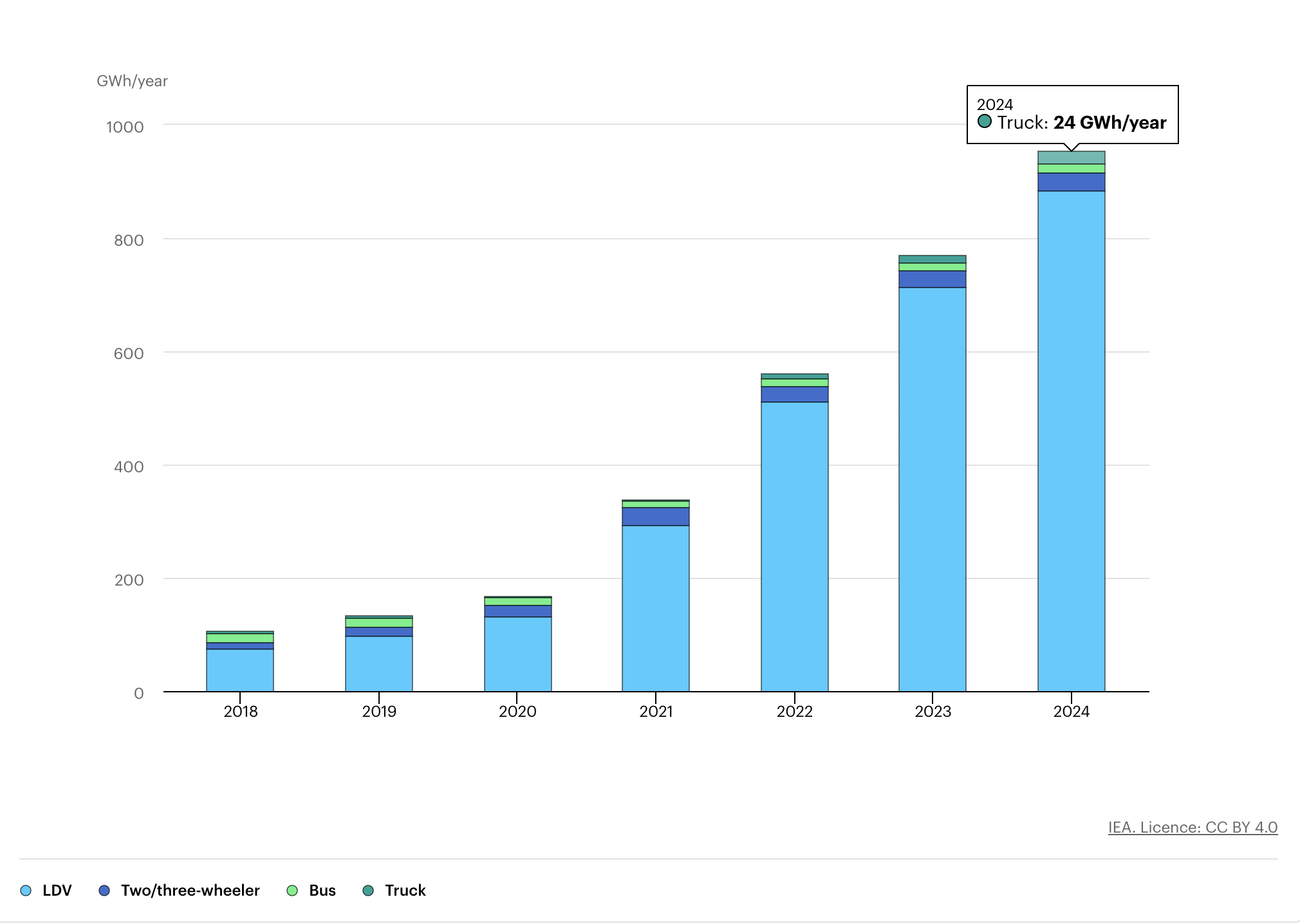 Other categories of EV battery demand were on the rise in 2024, too, including a big leap for light-duty vehicles. That alone isn’t surprising, considering smaller passenger EVs are the biggest relevant market by far, but the jump from 713 gWh in 2023 to 884 gWh last year represents a 24% increase. It’s a reminder that electric trucks are but a small piece of the larger EV pie, and that seems likely to be the case again in 2025.