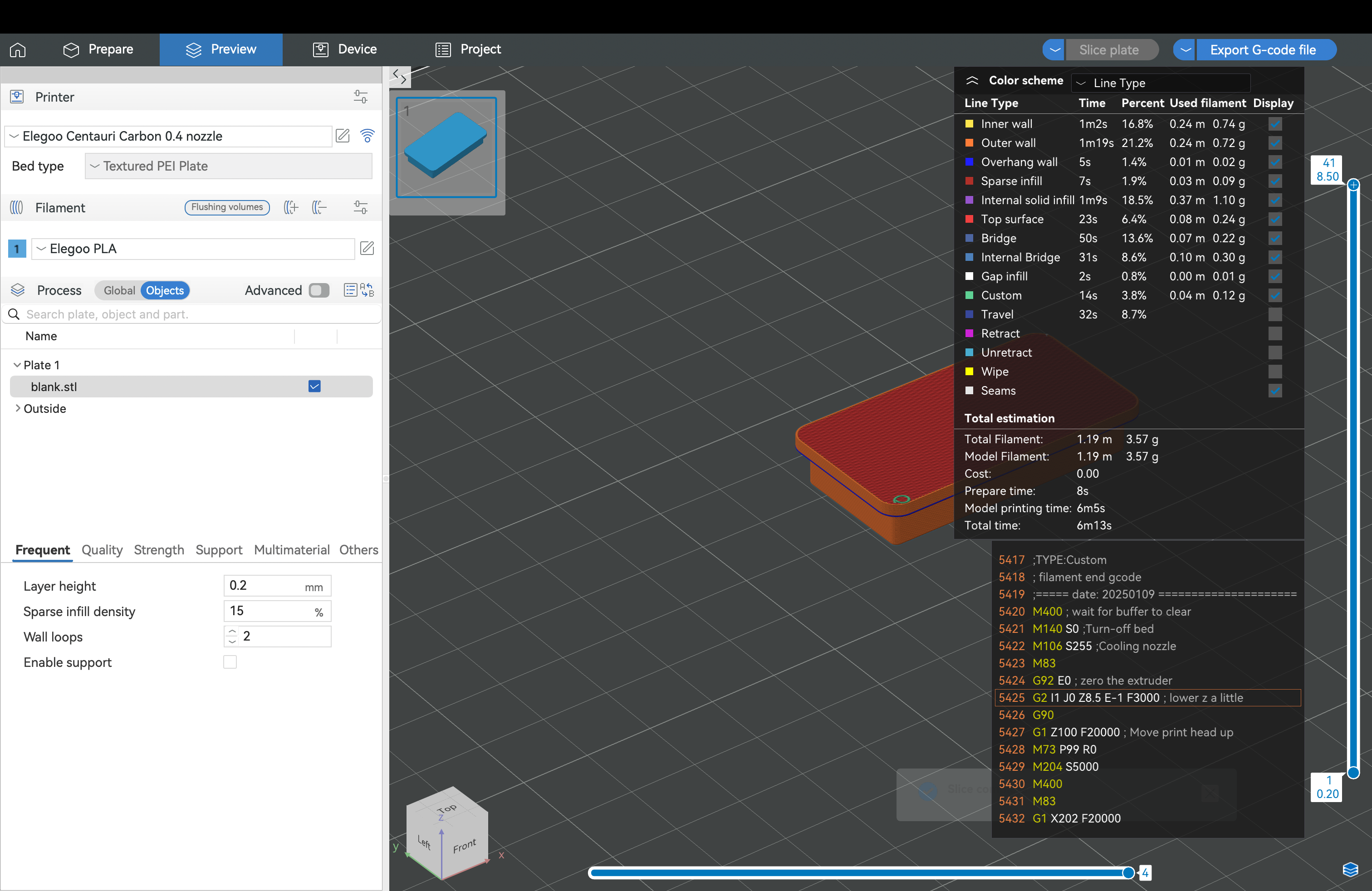 Once I had the file, I had to load it into the Elegoo Slicer (free software for the printer) to create a G-code. While the STL file is like the blueprint of your model, the G-code is like the instruction manual on how to make it. It translates the 3D model into a language the printer can understand. It also gives you one last look at the model, along with dimensions.