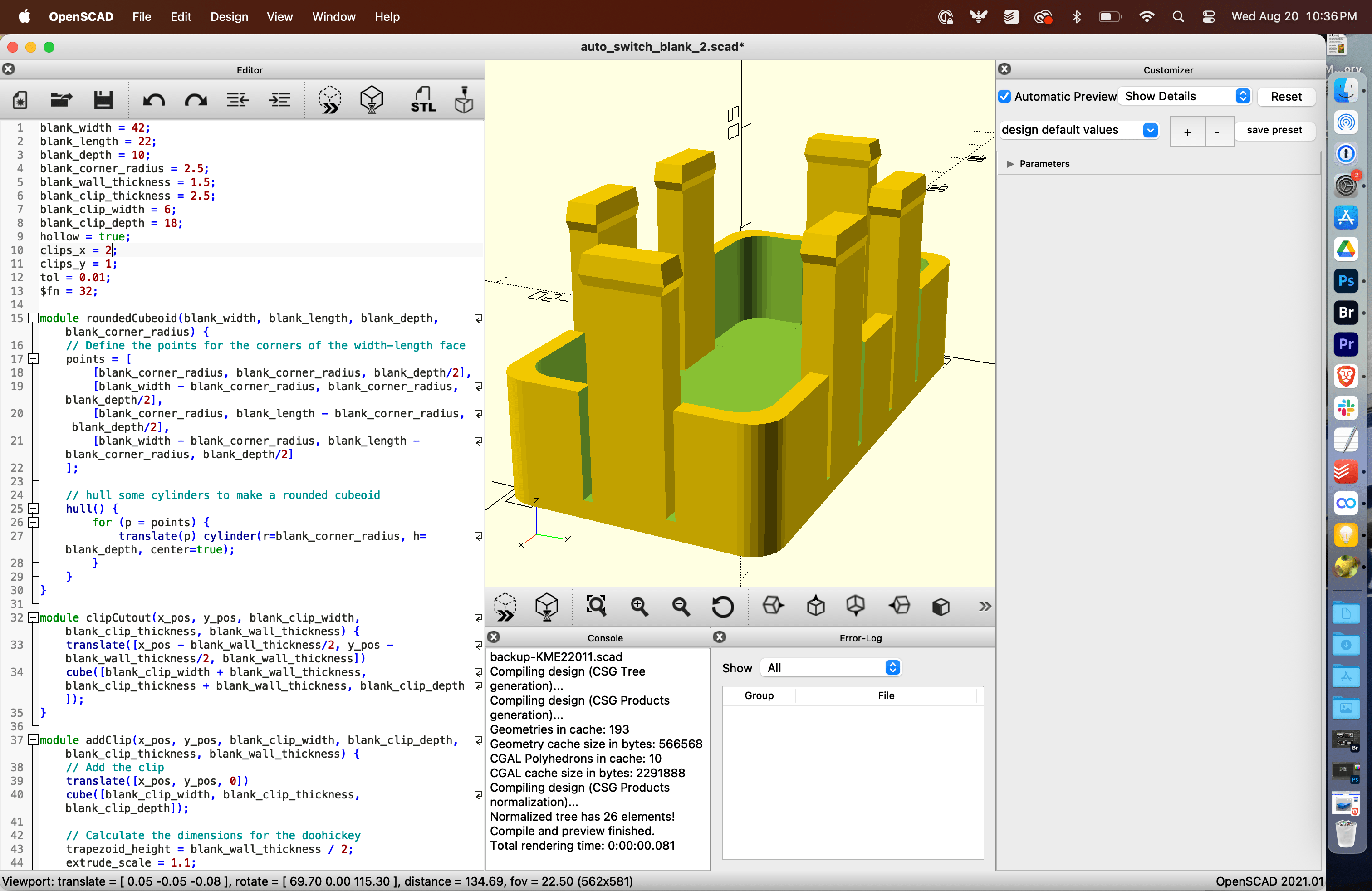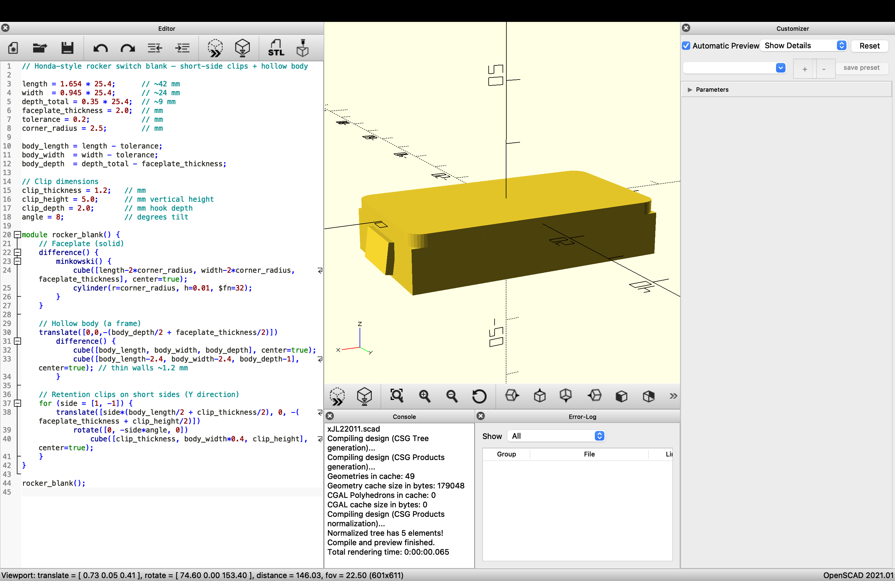 There are far more design software choices out there, including, of course, CAD programs that let you play with shapes in a real-time graphical interface rather than text. And I’m eager to try those, but for the sake of this test print, I ultimately went back to the free switch panel template and only made the 2mm tweak to the length I needed for my Civic application using OpenSCAD.