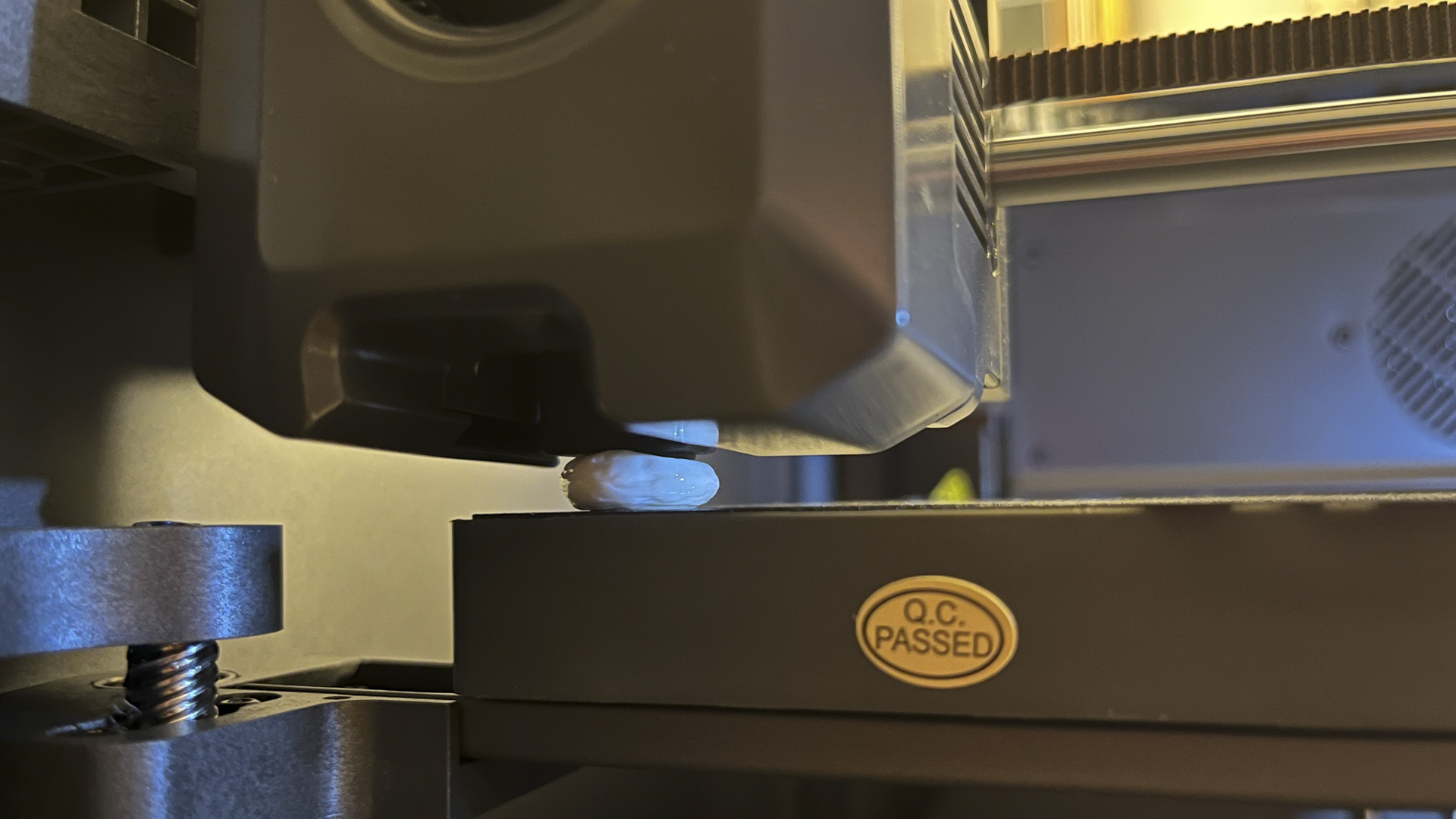 The device started puking out a puddle of filament. A white blob was quickly melting and solidifying, entombing the nozzle in its own emulsion. Panicked, I killed the power and scratched my head. Then, after giving the nozzle a minute to cool a little, but not too long to let it get cold, I plucked the gross shape it’d crapped out and carefully picked away the excess plastic with a tiny blade.