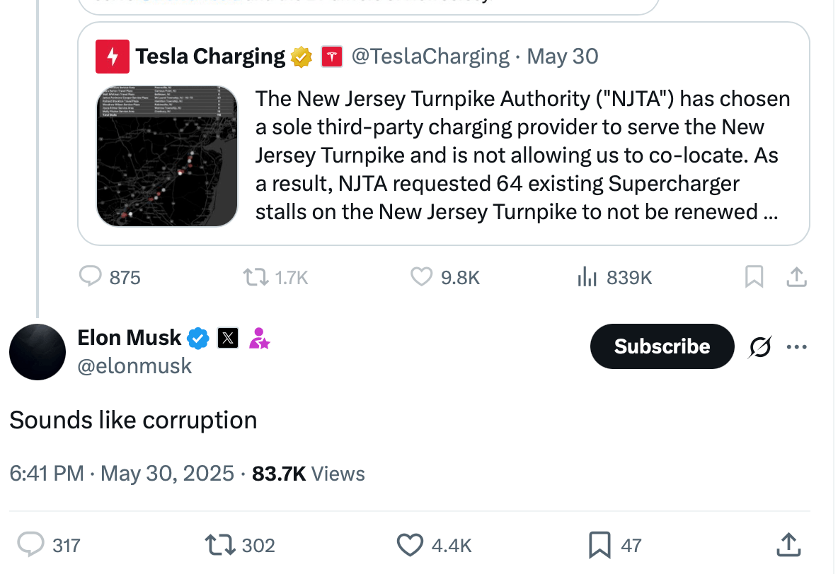 Tesla claimed in the post that it offered the NJTA “above-market commercial terms,” which included offering to build Superchargers at the New Jersey service plaza with equipment upgrades. The claimed upgrades would have included Superchargers with screens and NACS cables equipped with CCS1 “magic docks” (Tesla’s adapter for NACS to CCS1).