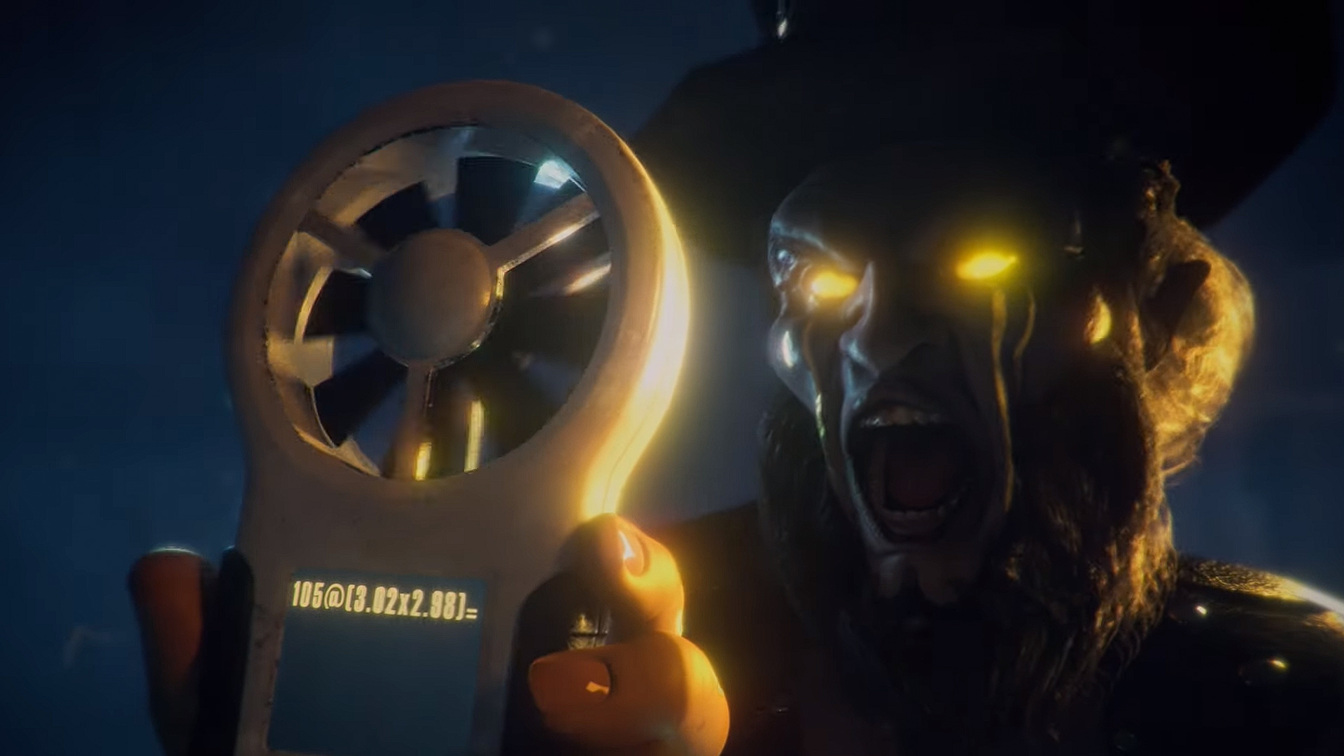 Several numbers are thrown out on the screen of what looks to be a digital anemometer. Then a leprechaun, who looks like he came third in a Slash impersonation competition, screams into it.