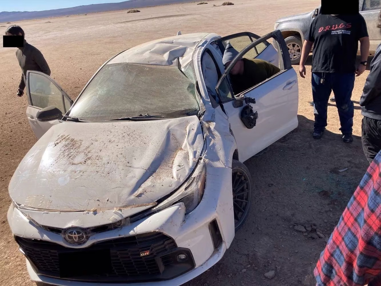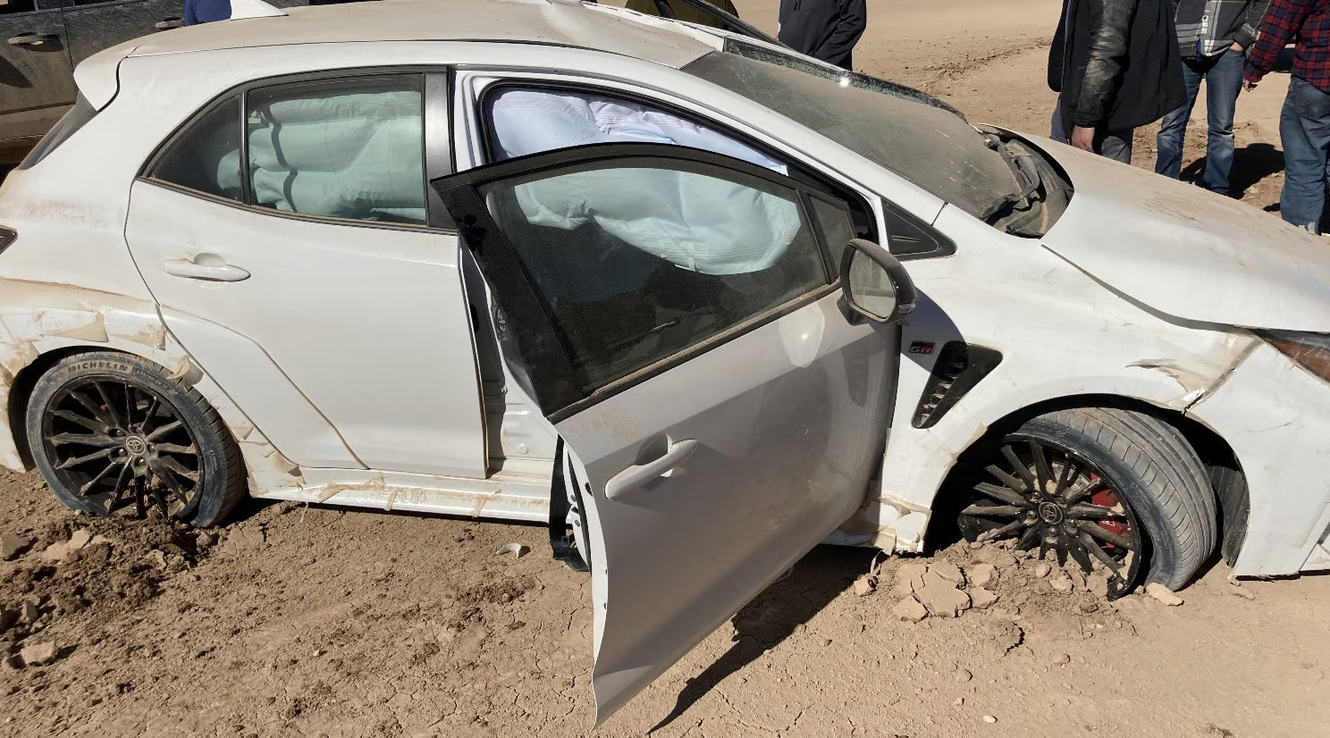 The origin of the photographs isn’t apparent, but they have been disseminated via users of the GR Corolla Forum. They show the Toyota having taken an almighty whack on its roof and A-pillar, the airbags deployed, and its driver-side mirror mangled and dangling off like that scene in End of Evangelion. It appears the driver was hooning their GR Corolla on a dry lakebed, only for one side of the car to dig in—the snaking tire tracks in the background of some shots indicate this.