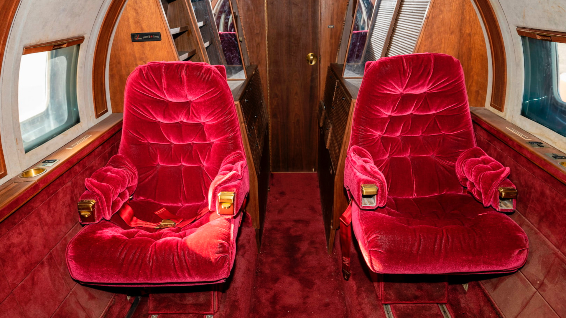 The 1962 Lockheed Jetstar was bought by Elvis in 1976 for a whopping $840,000. At the time, it was a stylish, luxurious plane, with wood paneling, red velvet seats and carpet, and even an onboard VCR and microwave. For 1962, that was pretty fancy stuff. All six of its individual chairs spun and reclined and there was even a matching bench seat. And in very ’60s fashion, the chairs had slide-out ashtrays built into their armrests. I can only imagine what the cabin smelled like during Elvis’ ownership. Now, though, the jet is a shadow of its former self.