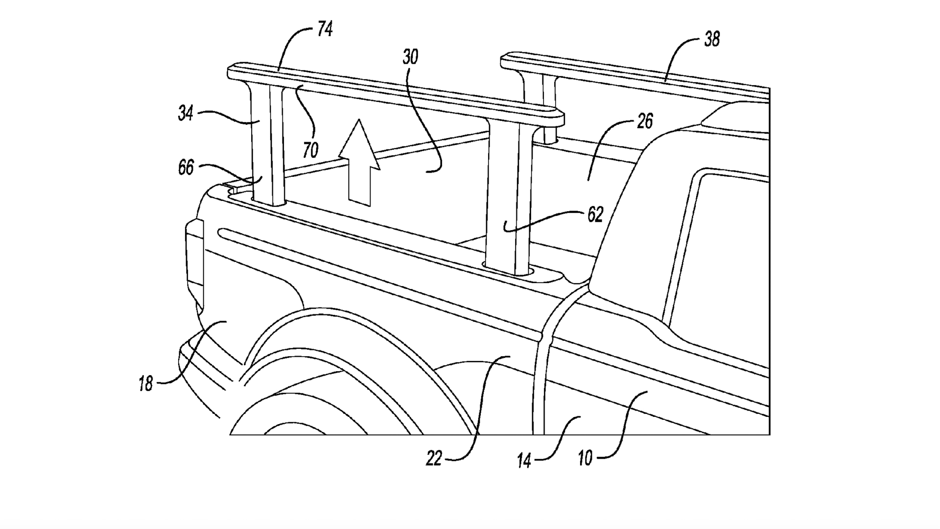 Ford’s latest patent could drastically increase the usability of pickup truck beds, allowing for customers to nearly double the size of their cargo capacity at the push of a button. The new patent, filed with the United States Patent and Trademark Office (USPTO), via CarBuzz, proposes rising rails on the walls of a bed that can not only hold large items of their own, but act as mounting points for additional storage compartments.