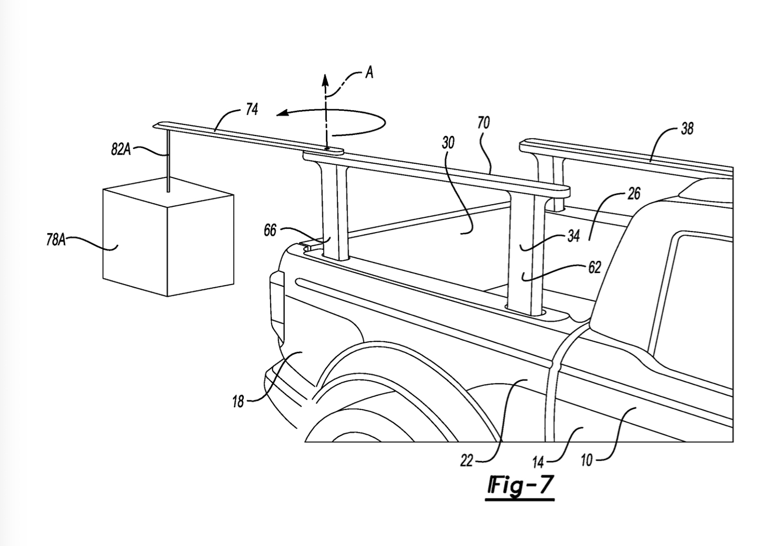 Under normal circumstances, the rails would stay retracted, inside the bed walls. But when deployed, actuators could extend the bed rails up on either side. With just the rails in their extended position, owners can store longer items like lumber or ladders—think anything too long to normally fit in the bed—horizontally across the bed, freeing up space underneath for other storage. If the long item is too heavy to lift up onto the fully extended rails, owners can place it across the bed walls with the rails retracted and then let the actuators do the lifting for them. According to Ford’s patent documents, each actuator is capable is lifting 1,320 pounds, but the filing doesn’t say how much weight each rail can hold without bending.