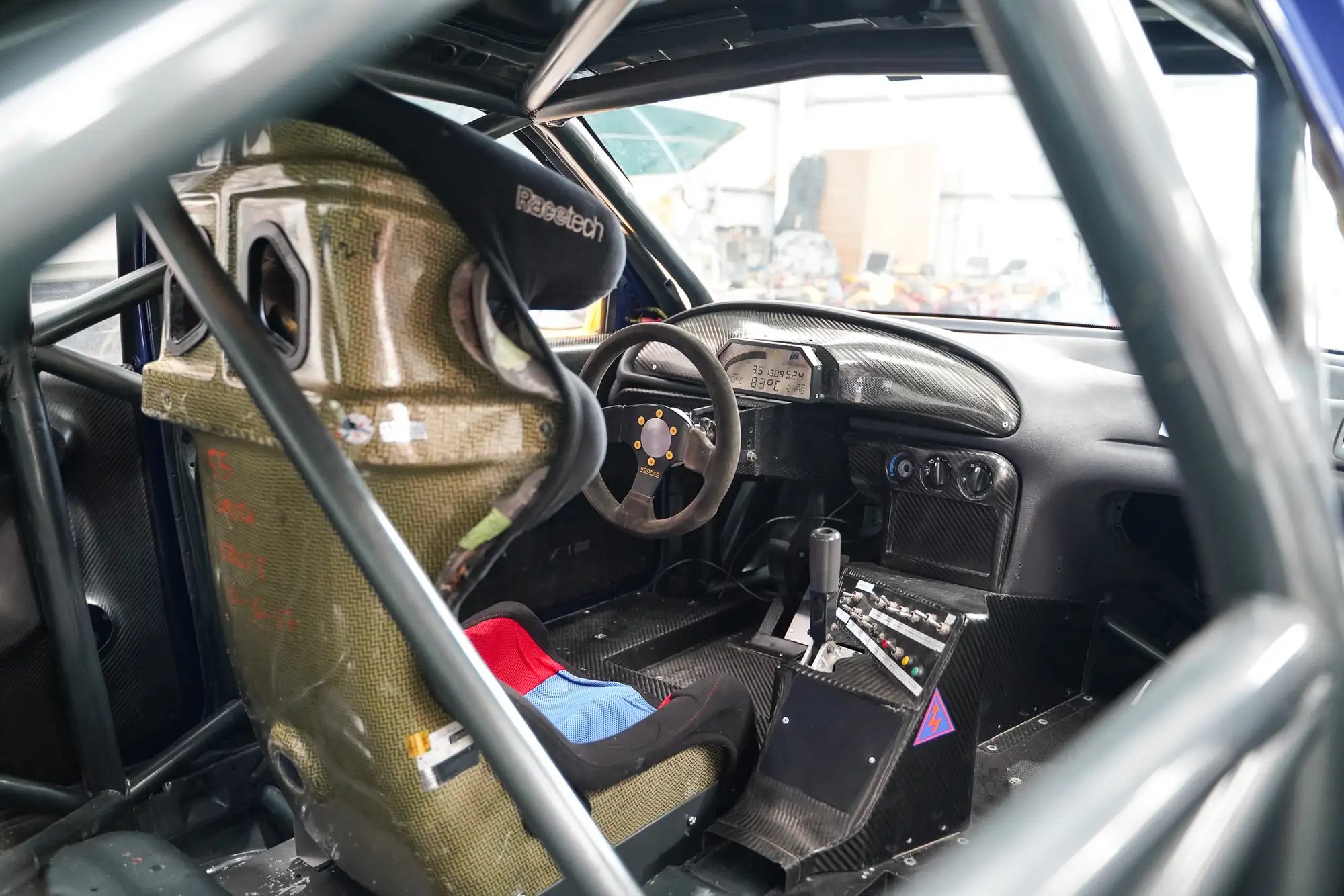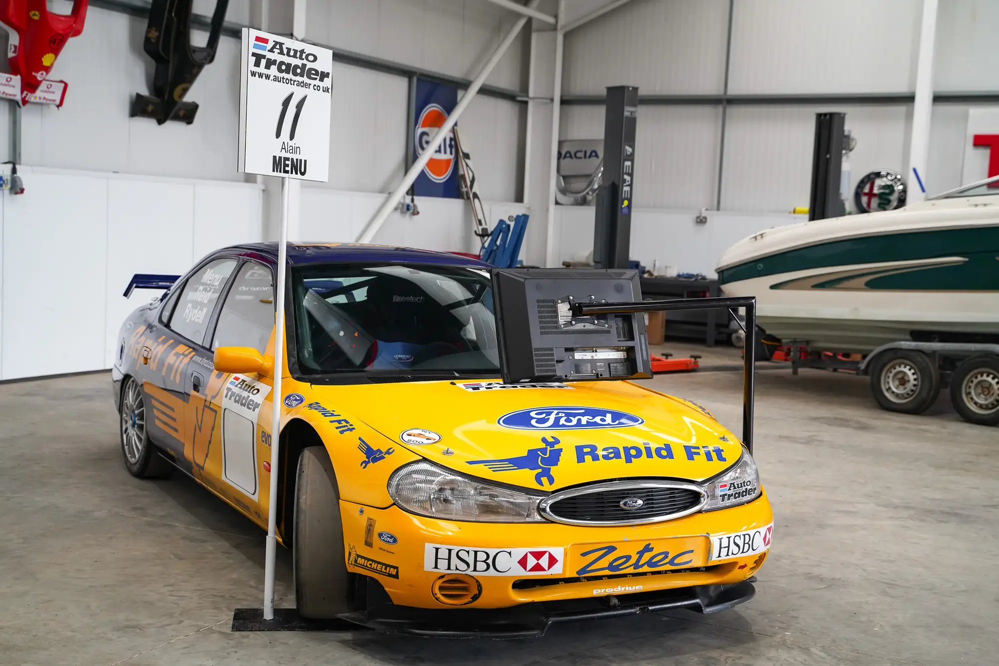 The TOCA series was beloved in its day and pretty punishing relative to contemporary rivals, with real tracks and damage modeling. Still, it’s amusing to think of this Mondeo shell being positioned as a “simulator,” given that it’s paired with such a rudimentary game. I’d love to know how the vehicle’s inputs are wired up to the console, wherever it’s been tucked away. A mobile monitor extended on an arm above the hood displays the game, while the LCD readout behind the steering wheel looks to be a sticker, rather than presenting any actual data.