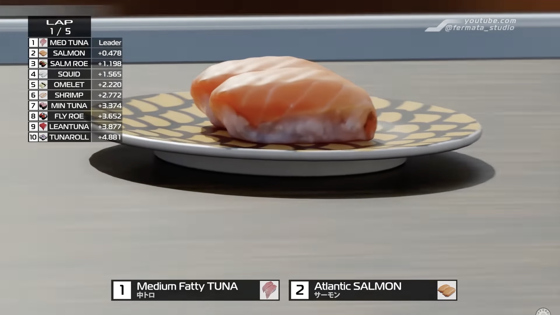I can tell you what Formula Sushi is, but I can’t tell you why it exists. A YouTuber with a penchant for trains and strange 3D animation decided that “the sushi on the conveyor belt lacks a sense of speed,” and that what the kaiten-zushi experience really needed was the full Formula 1 broadcast treatment. Imagine one of F1’s sprint races, but instead of cars representing Saudi royalty and gambling sites, the race was just between plates of raw seafood rested on rice. And instead of a track, they were racing around the counters of an escherian restaurant. (Hey, band name idea.)